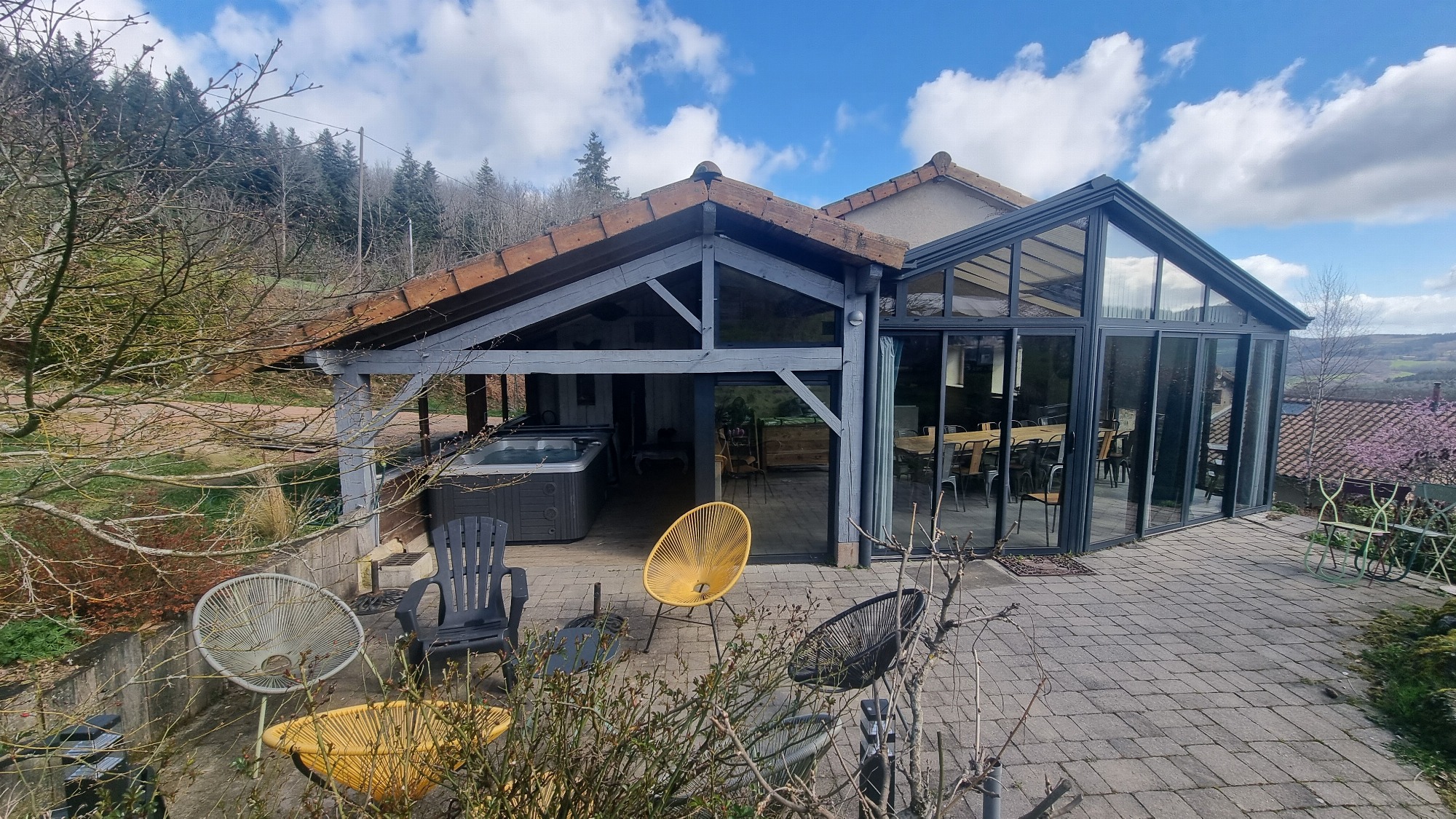 Capacité de 20 personnes en été. Capacité de 15 personnes en hiver. Les séances de SPA-balnéothérapie s'organisent sur réservation, 4 personnes max, et durée de la séance 1h00 : 12€/pers. Peignoirs et serviettes de bain sont à votre disposition. Possibilité de réserver un Mâchon Beaujolais : 12 € / pers. (assiette de charcuterie, fromage, produits locaux) Location de salle supplémentaire de 60 m2, pour inviter vos amis, repas de famille, séminaire, stage... A disposition : videoprojecteur, TV, coin cuisine, frigo,... : 120 € / jour. (Pour un repas assis 30 personnes maximum)