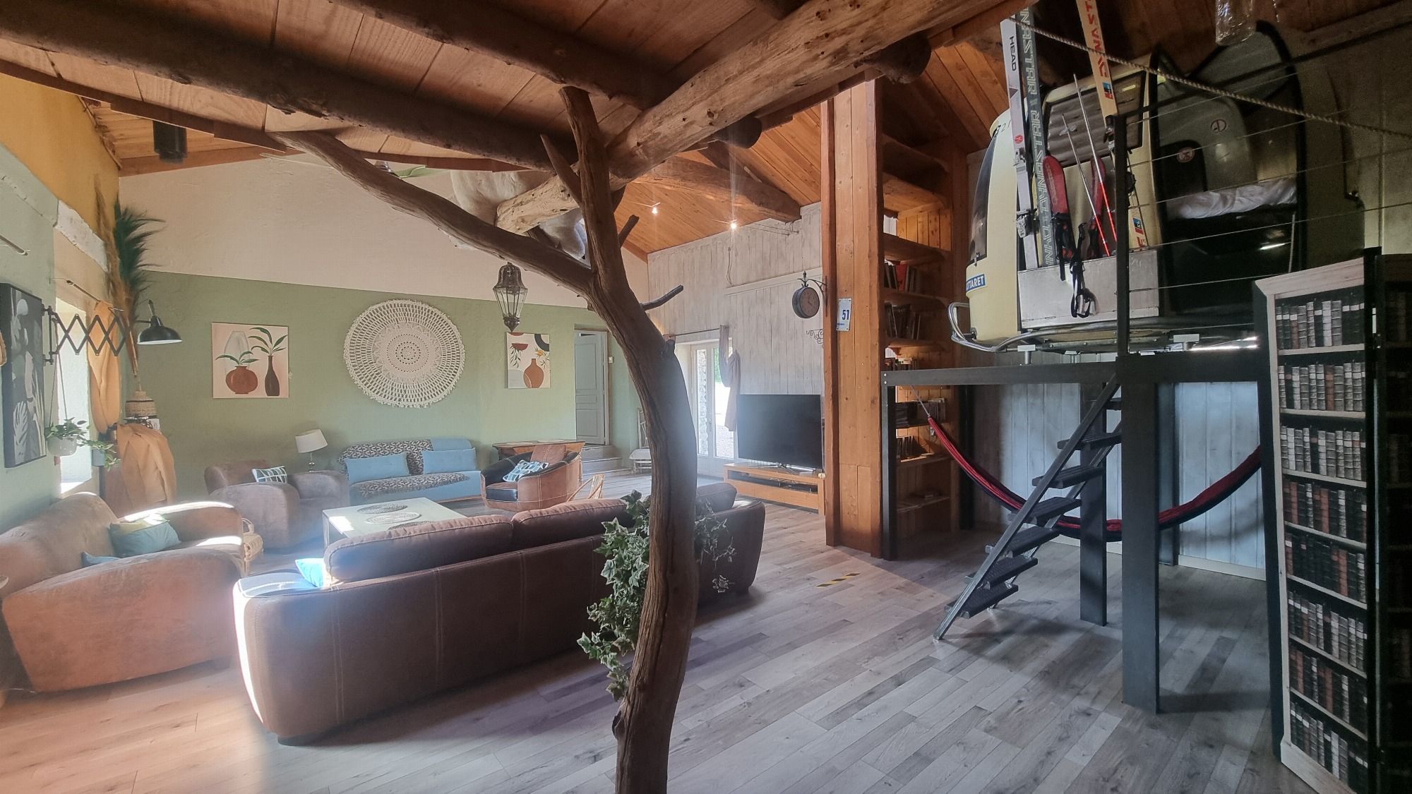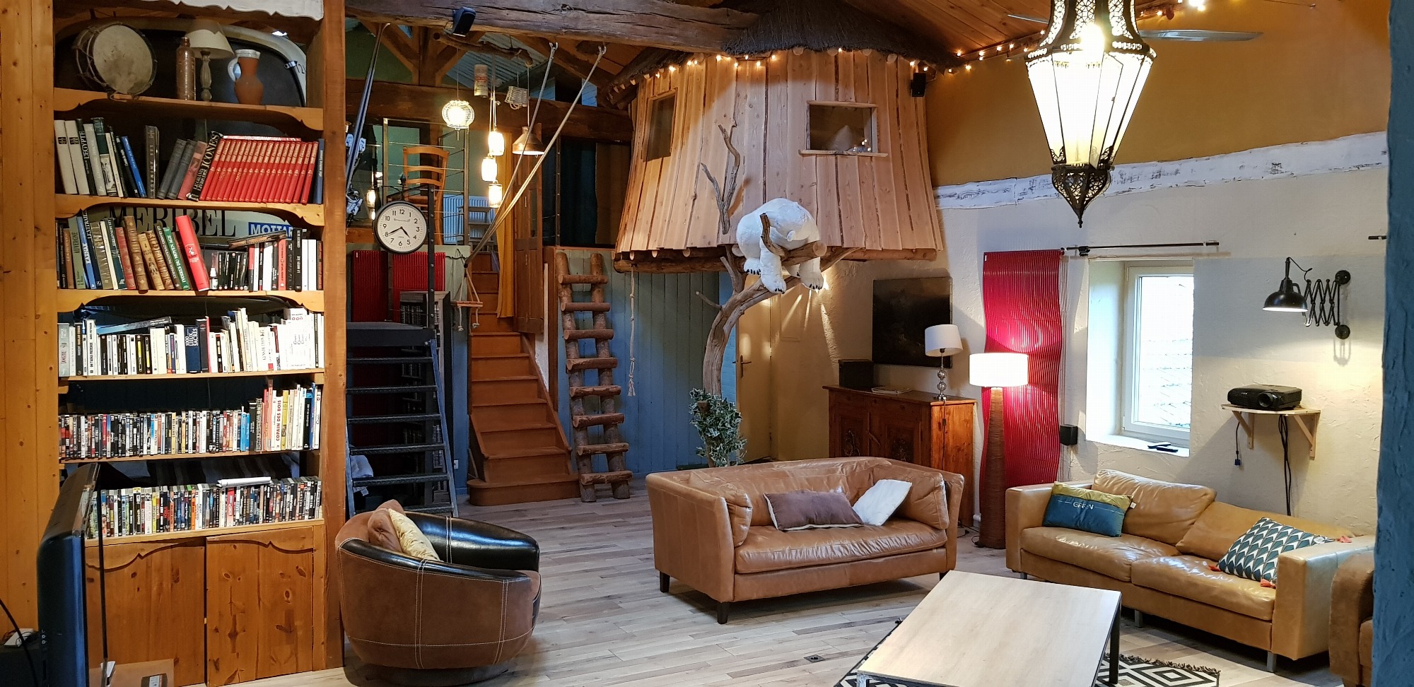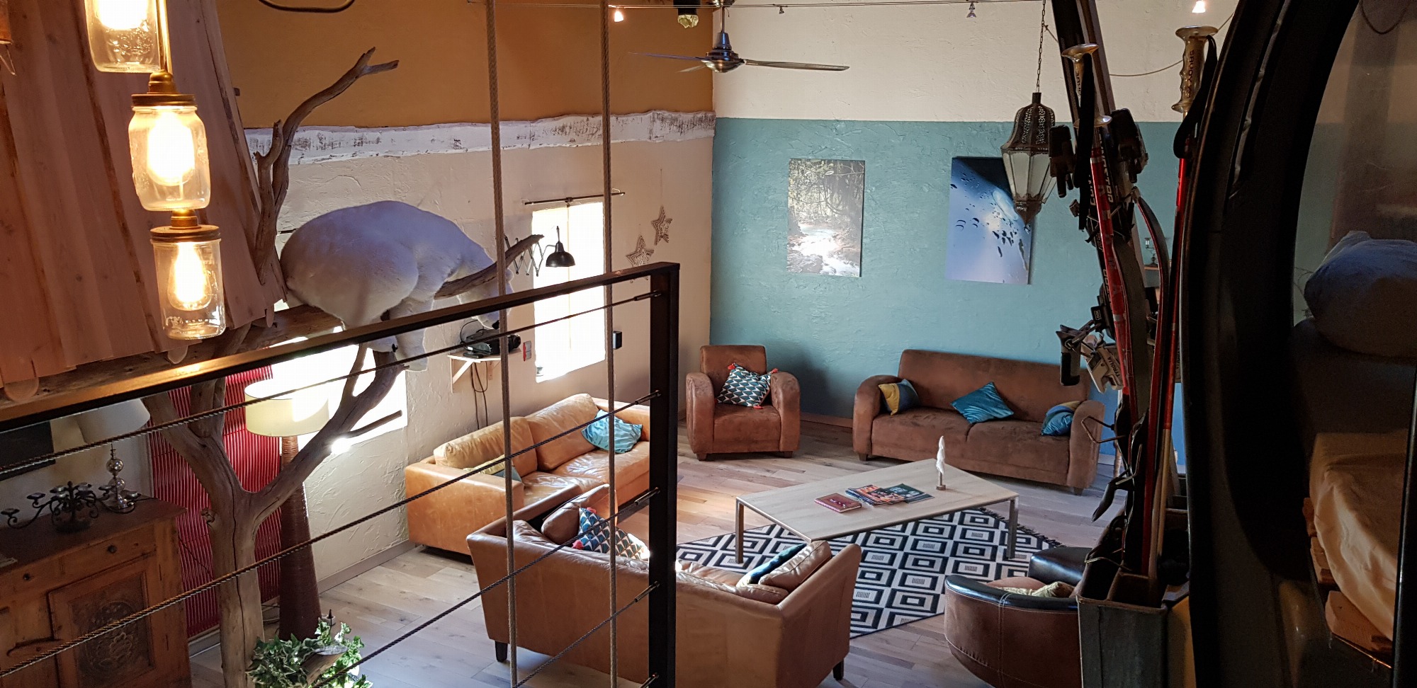 Gîte de groupe ( 20 personnes maximum) original comprenant deux chambres atypiques indoor : une cabane suspendue et une télécabine POMA, ainsi qu'à l’extérieur : 1 caravane américaine Airstream.