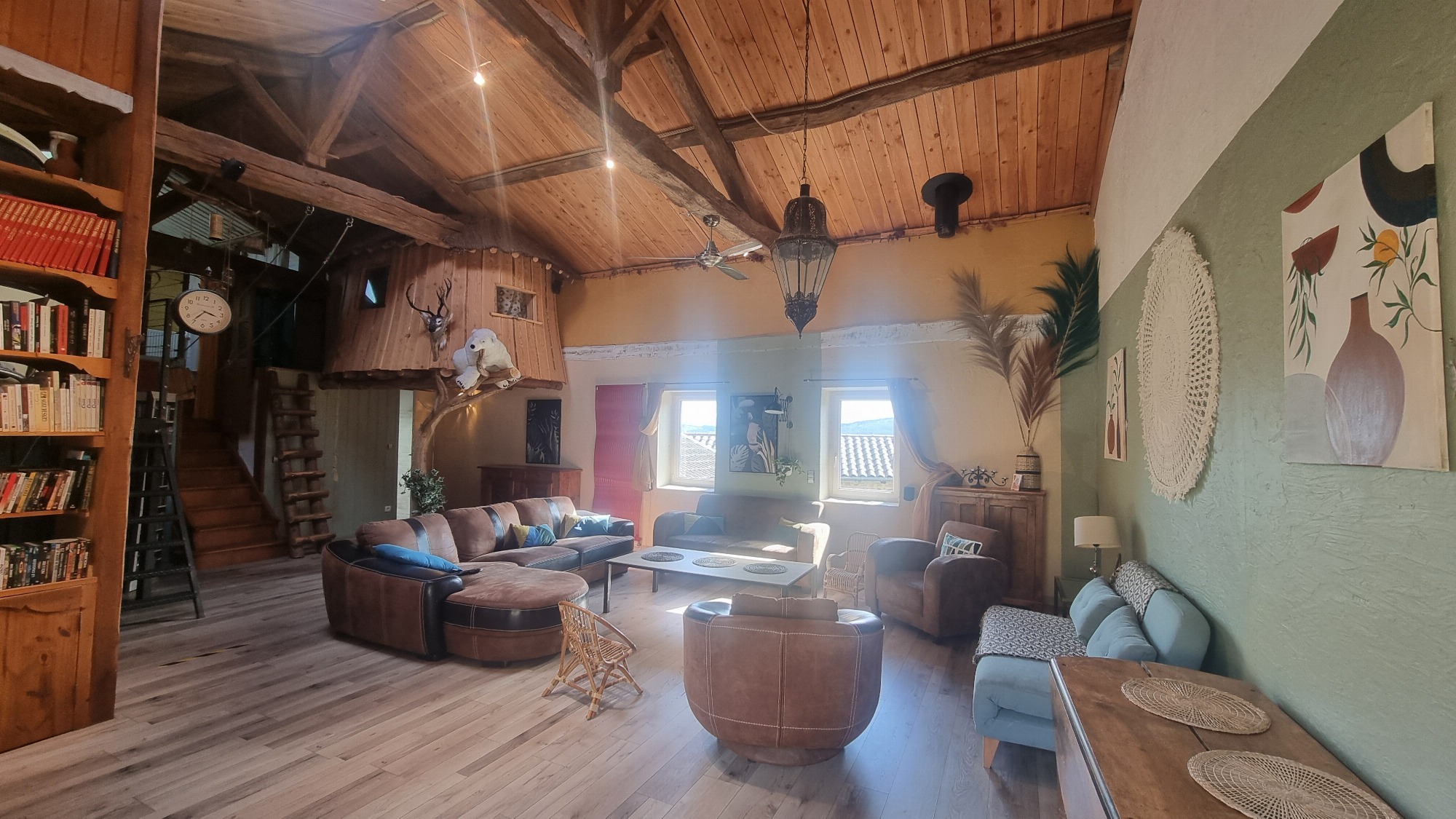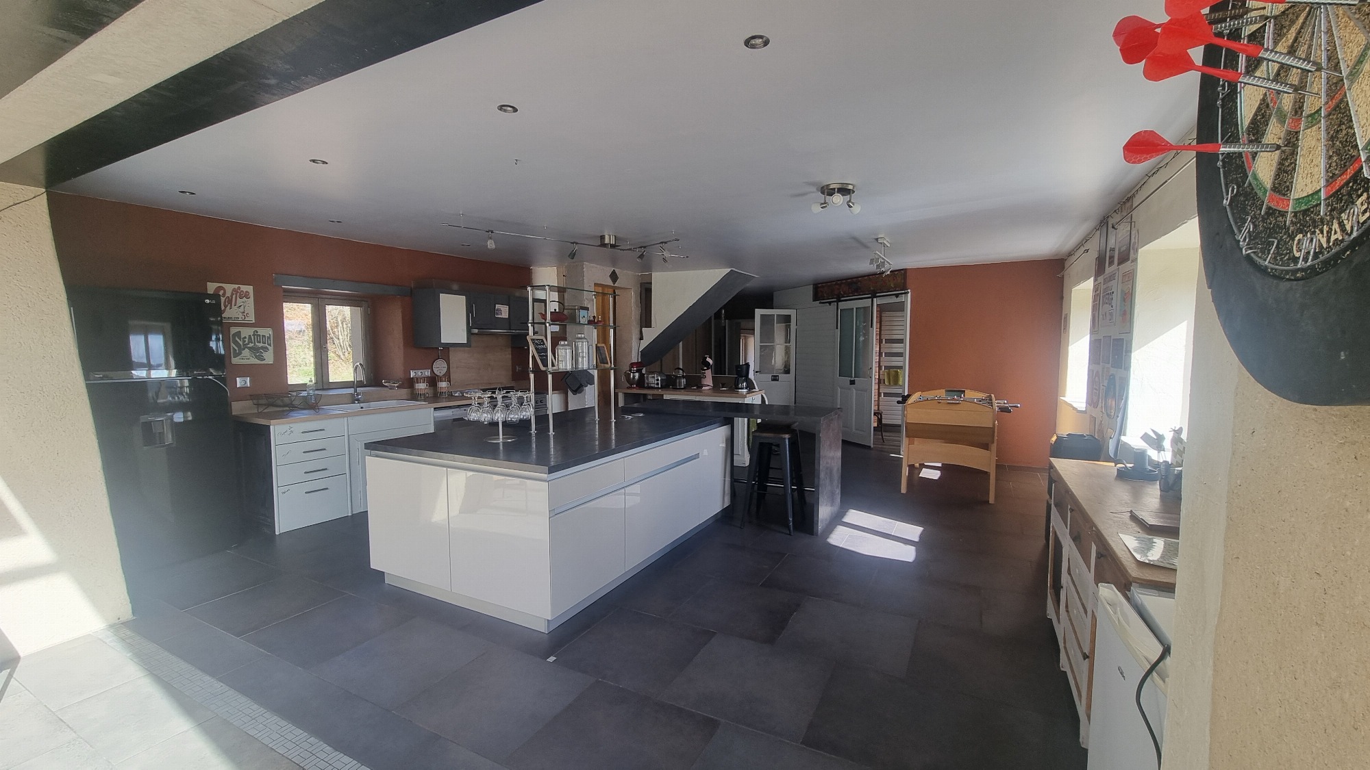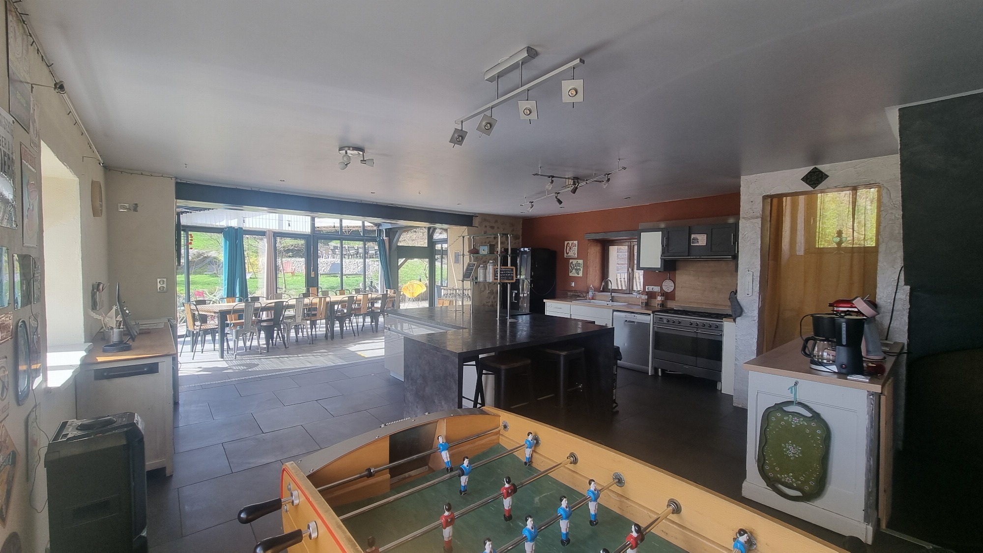 Le vaste salon est équipé d'une bibliothèque, vidéothèque, d'un home cinéma, une baby foot, et de confortable canapés pour vous installer.