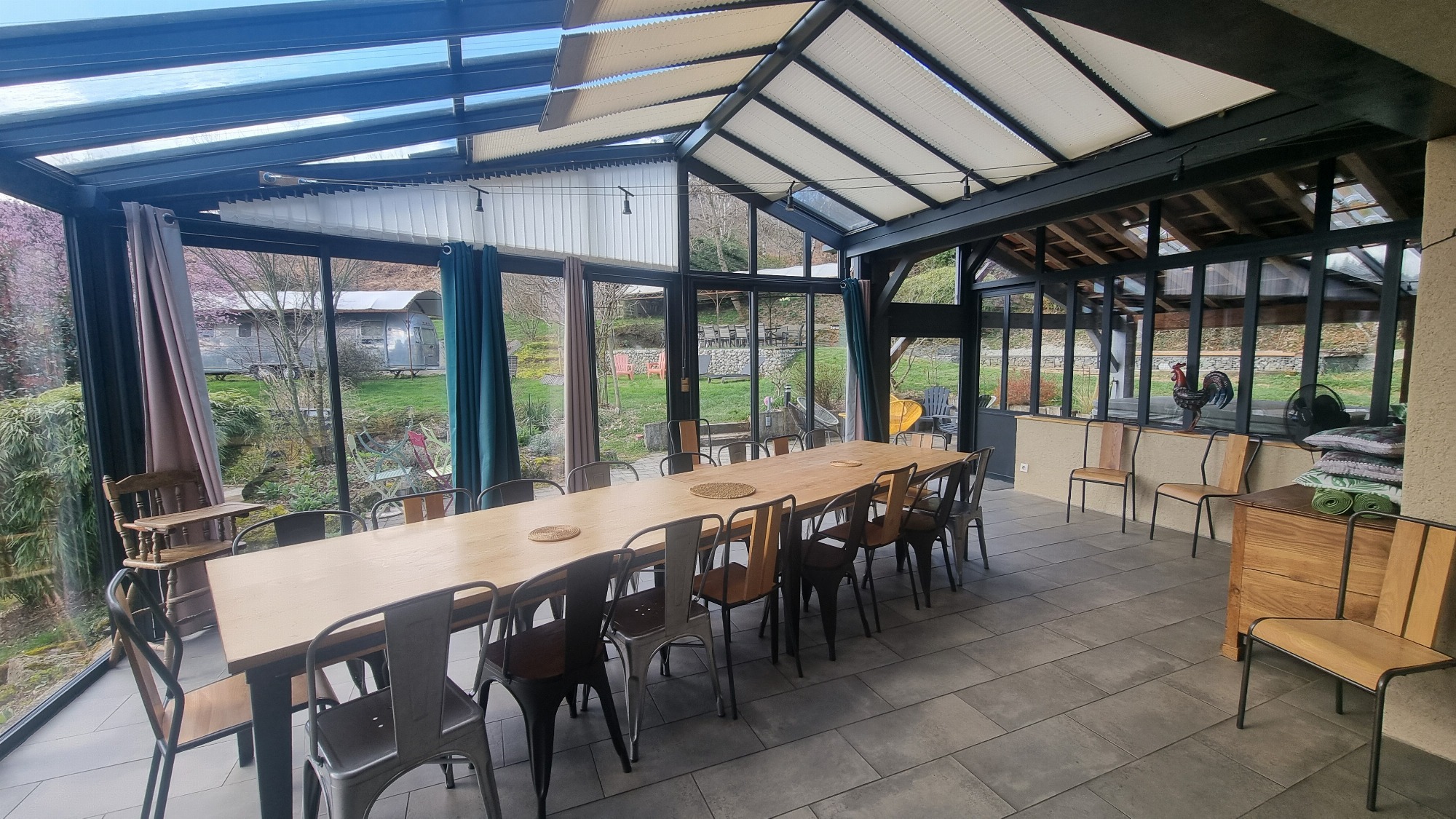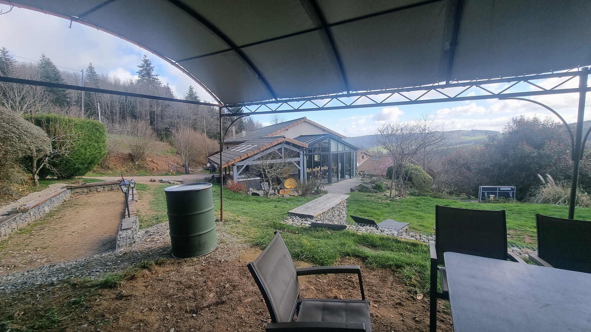 A l’extérieur, le salon de jardin vous permet de profiter du grand air et du paysage. Sur la terrasse est instalée une très grande table. Une plancha à gaz, un barbecue à gaz et barbecue à charbon est aussi mise à votre disposition, ainsi qu'un espace "feu de camp", une table de ping-pong, un terrain de pétanque.