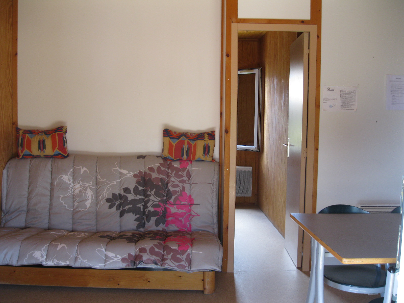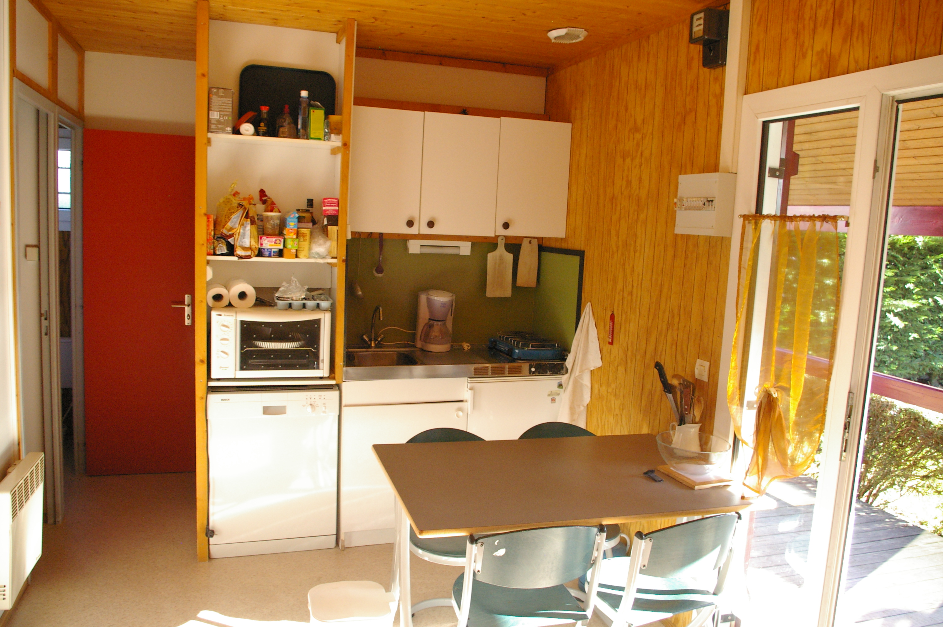 Chaque chalet se compose d'un séjour avec banquette clic-clac et kitchenette , 2 chambres (1 lit 140 et 2 lits 90), une salle de bains avec douche et lavabo, wc indépendant