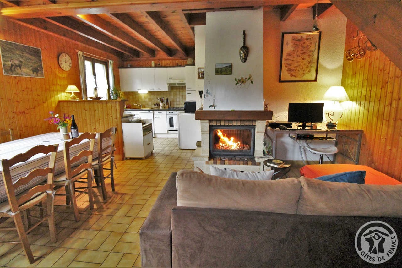 A l'étage : séjour, coin cuisine (m.-ondes, congélateur), coin détente. Salle de bains, wc indépendant. Etage : 2 ch. (1 ch. 1 lit 2 pers., 1 ch. 3 lits 1 pers. dont 1 superposé), une petite mezzanine (1 lit enfant). Lit bébé. Chauffage électrique, bois fourni. Tél. mobile avec caution. Terrain aménagé non clos, salon de jardin, barbecue, parasol, chaises longues, boules de pétanque. Possibilité vente produits fermiers, visite de l'exploitation. A 500 m, plan d'eau aménagé (pêche, camping, aire pique-nique), ombragé.