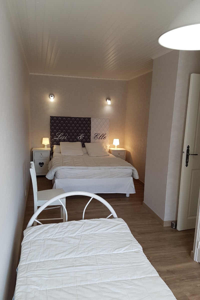 A l'étage, trois chambres avec lits en 140 et 90 Salle de bain avec WC. Terrasse aménagée avec salon de jardin et accès à 300m² d'espaces verts.