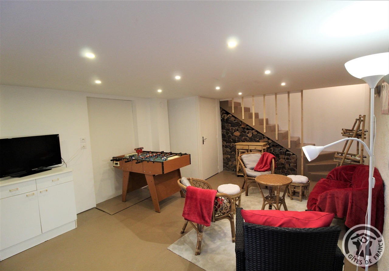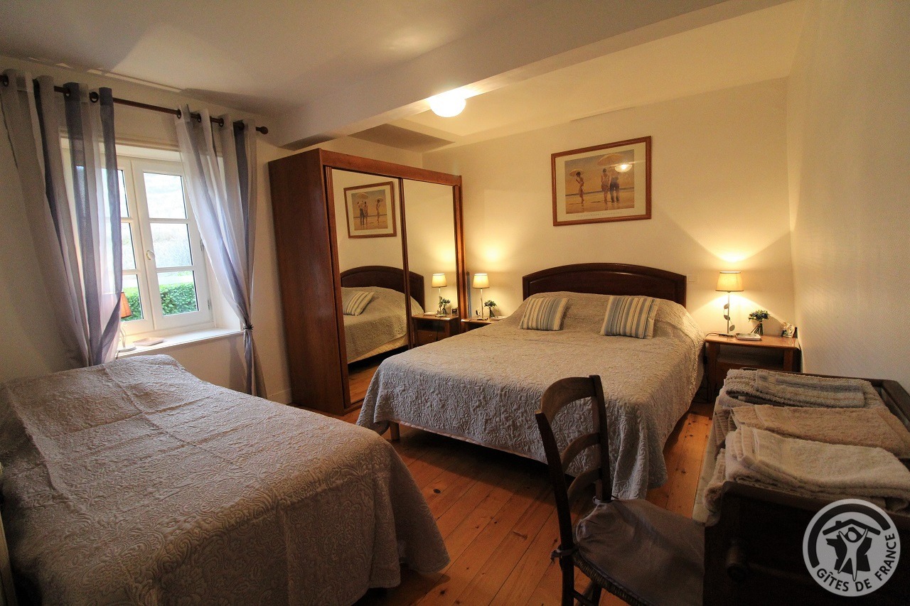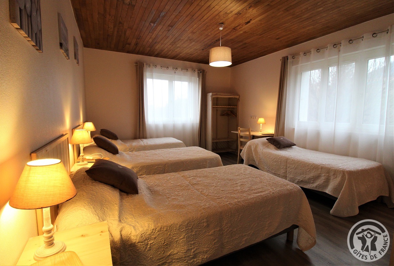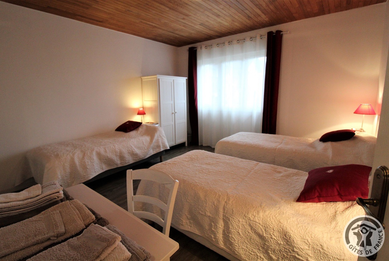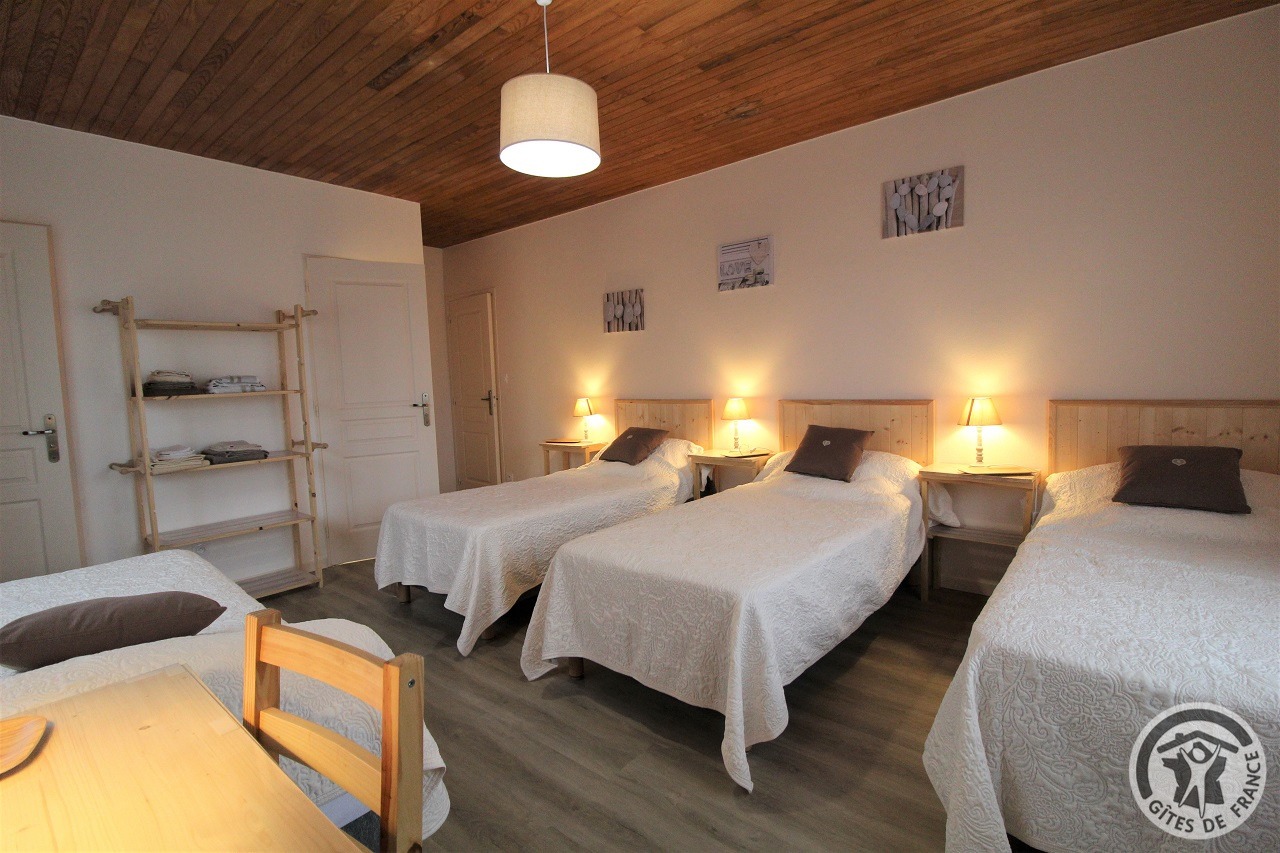 Gîte à l'étage (accès de plain-pied sur l'arrière de la maison). Petite entrée, pièce de jour (espace cuisine, espace repas, espace salon, TV avec chaînes étrangères). 1 chambre (1 lit 2 personnes 160 X 200 cm et 1 lit 1 personne). Demi- étage inférieur : couloir, 3 chambres (1 chambre 2 lits 1 personne) (1 chambre 3 lits 1 personne avec salle d'eau et Wc privatifs) (1 chambre 4 lits 1 personne avec salle d'eau et Wc privatifs). Salle d'eau. Wc (accès 2 marches). Équipement bébé sur demande (lit, chaise haute, matelas à langer, petite baignoire, pot). Draps, linge de toilette et de maison fournis sans supplément tarifaire. Rez-de-chaussée : salon/salle de jeux (petit espace cuisine, babyfoot). Wc avec lave-mains.