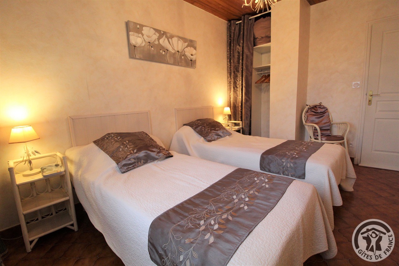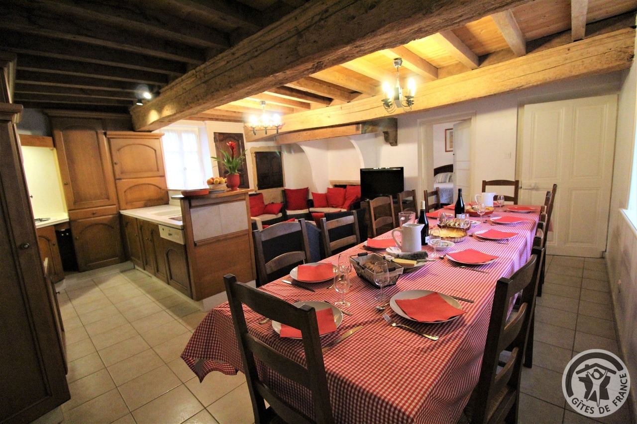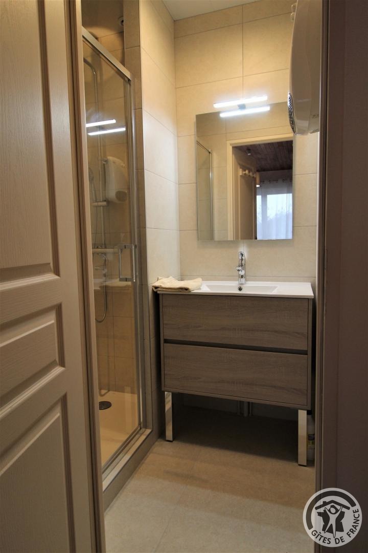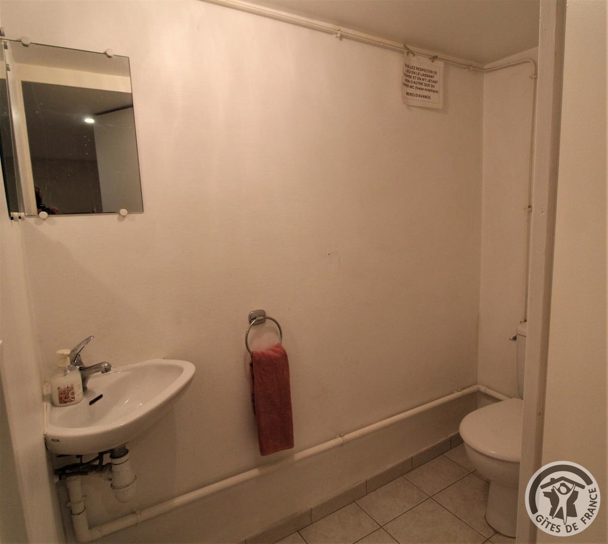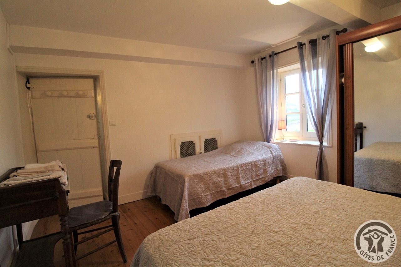 Gîte à l'étage (accès de plain-pied sur l'arrière de la maison). Petite entrée, pièce de jour (espace cuisine, espace repas, espace salon, TV avec chaînes étrangères). 1 chambre (1 lit 2 personnes 160 X 200 cm et 1 lit 1 personne). Demi- étage inférieur : couloir, 3 chambres (1 chambre 2 lits 1 personne) (1 chambre 3 lits 1 personne avec salle d'eau et Wc privatifs) (1 chambre 4 lits 1 personne avec salle d'eau et Wc privatifs). Salle d'eau. Wc (accès 2 marches). Équipement bébé sur demande (lit, chaise haute, matelas à langer, petite baignoire, pot). Draps, linge de toilette et de maison fournis sans supplément tarifaire. Rez-de-chaussée : salon/salle de jeux (petit espace cuisine, babyfoot). Wc avec lave-mains.