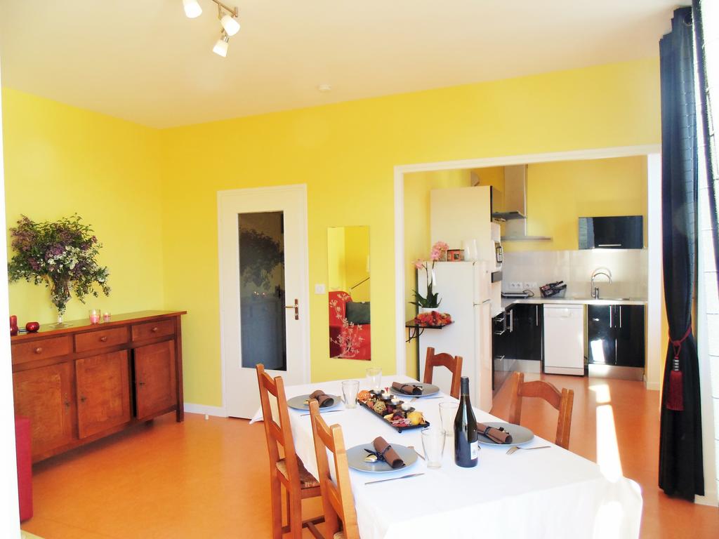 Accès commun dans un hall d'entrée, possibilité location du caveau. Appartement situé au 1er étage, comprenant : pièce de séjour, coin-cuisine, coin-repas, coin-salon (1 canapé convertible 2 pers.), 1 chambre séparée (1 lit double), possibilité de lit bébé). Salle d'eau, wc séparé. Draps et serviettes fournis. Possibilité location des 5 gîtes + salle pour un groupe. Idéal pour un séjour ou week-end en Beaujolais. Bar à vin, boutique, prestation dégustation de vins, petits déjeuners, terrasse commune, aire de jeux près de la salle des fêtes.