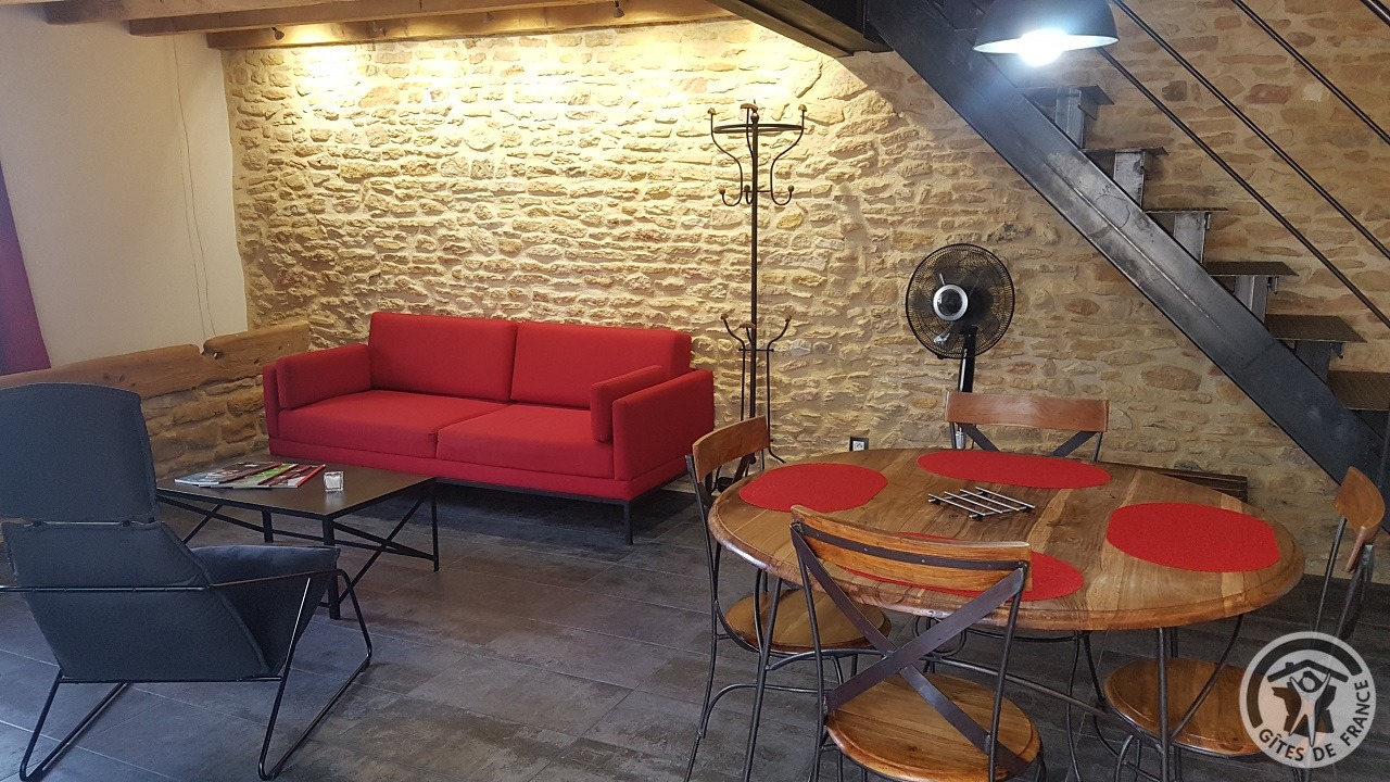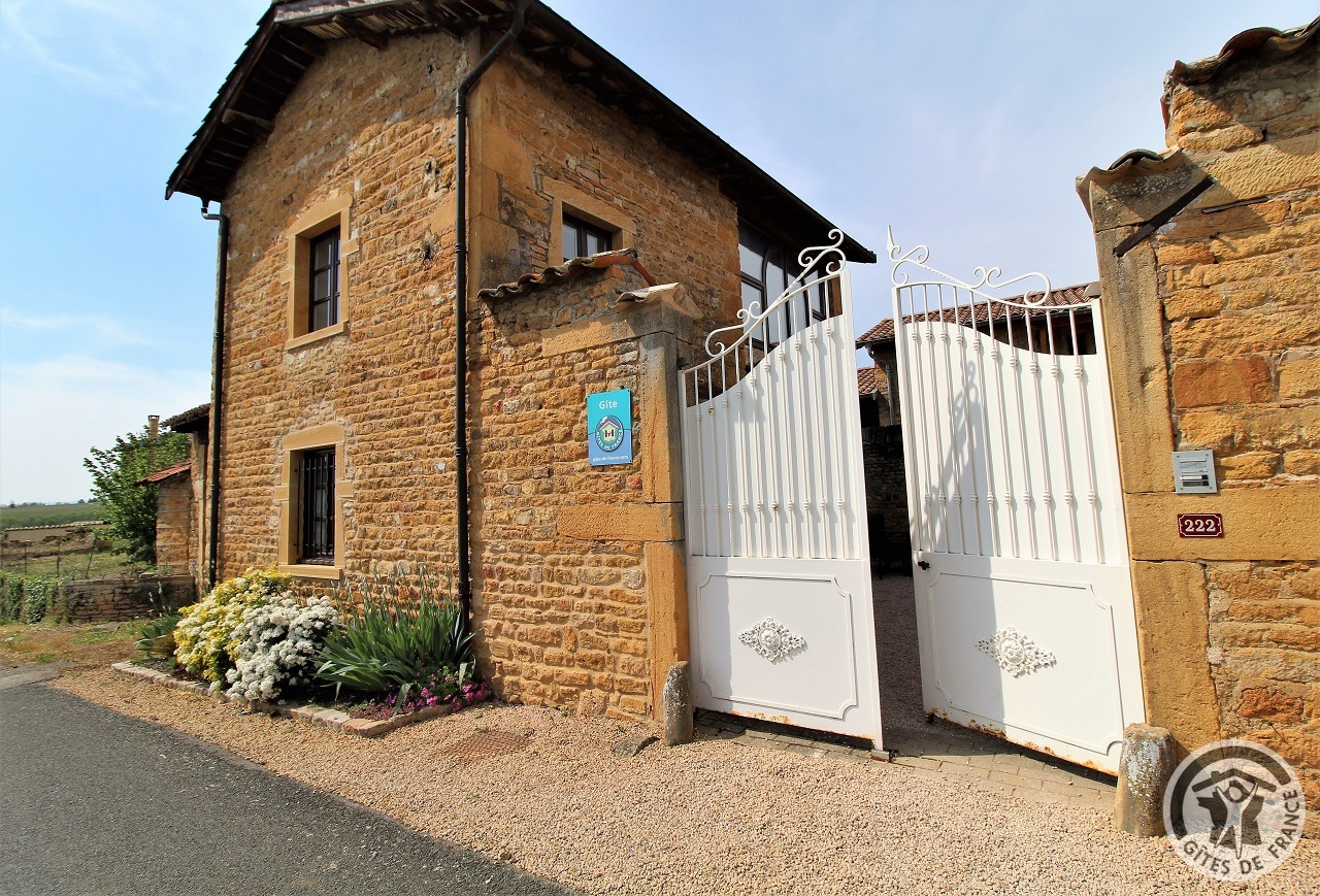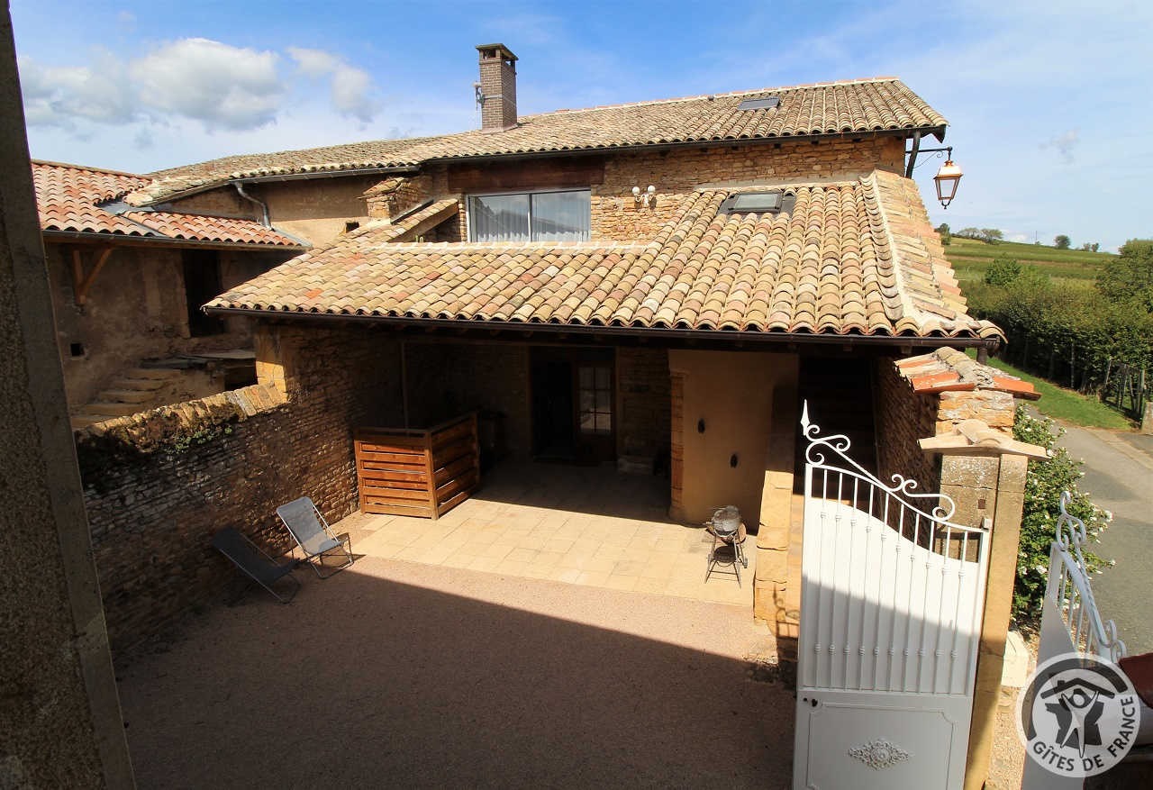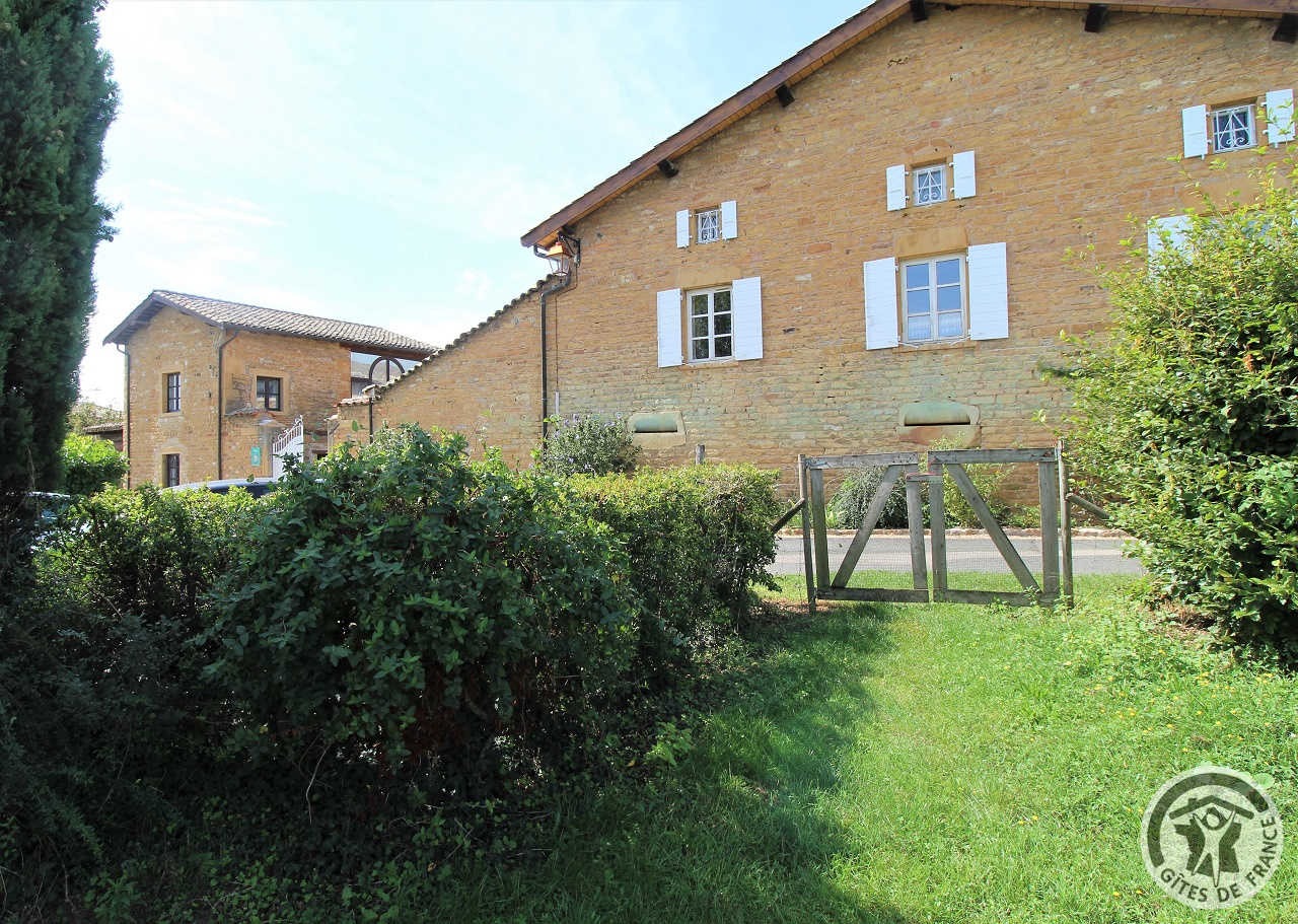 À quelques kilomètres de Villefranche-sur-Saône, gîte avec accès totalement indépendant, situé sur le même terrain que la maison des propriétaires (séparation par une cour intérieure). Ambiance moderne et chaleureuse : matériaux de grande qualité, murs en pierre, poutres apparentes et bel escalier en métal. Au rez-de-chaussée : vaste pièce de jour (espace cuisine intégrée, espace repas, espace salon), petit espace buanderie (fermé). À l'étage : couloir, 2 chambres (1 lit 2 personnes), (2 lits 1 personne). Salle d'eau. Wc. À l'extérieur : jardin privatif non attenant et clos (terrasse en bois, salon de jardin, barbecue), cour commune fermée. Accès possible au jardin commun (2 moutons, grande mare avec canard, poissons, grenouilles). Vue magnifique sur les vignobles et la Plaine de l'Ain. Parking privé. Équipement bébé sur demande (lit, chaise haute, baignoire). Draps, linge de toilette, torchons et kit produits d'entretien fournis gracieusement.