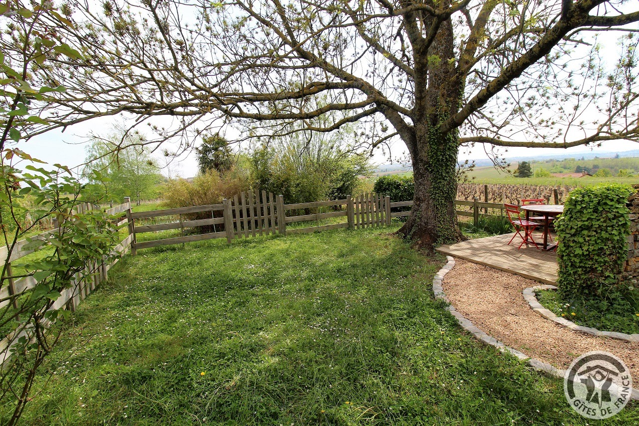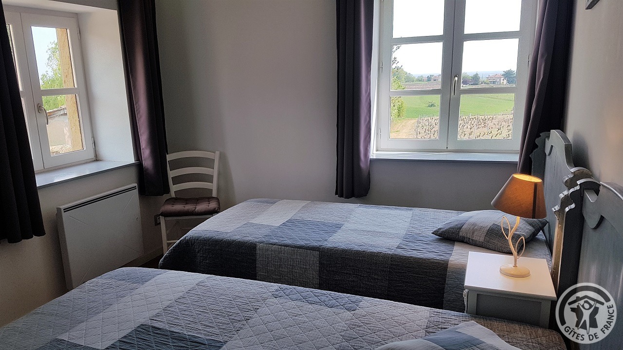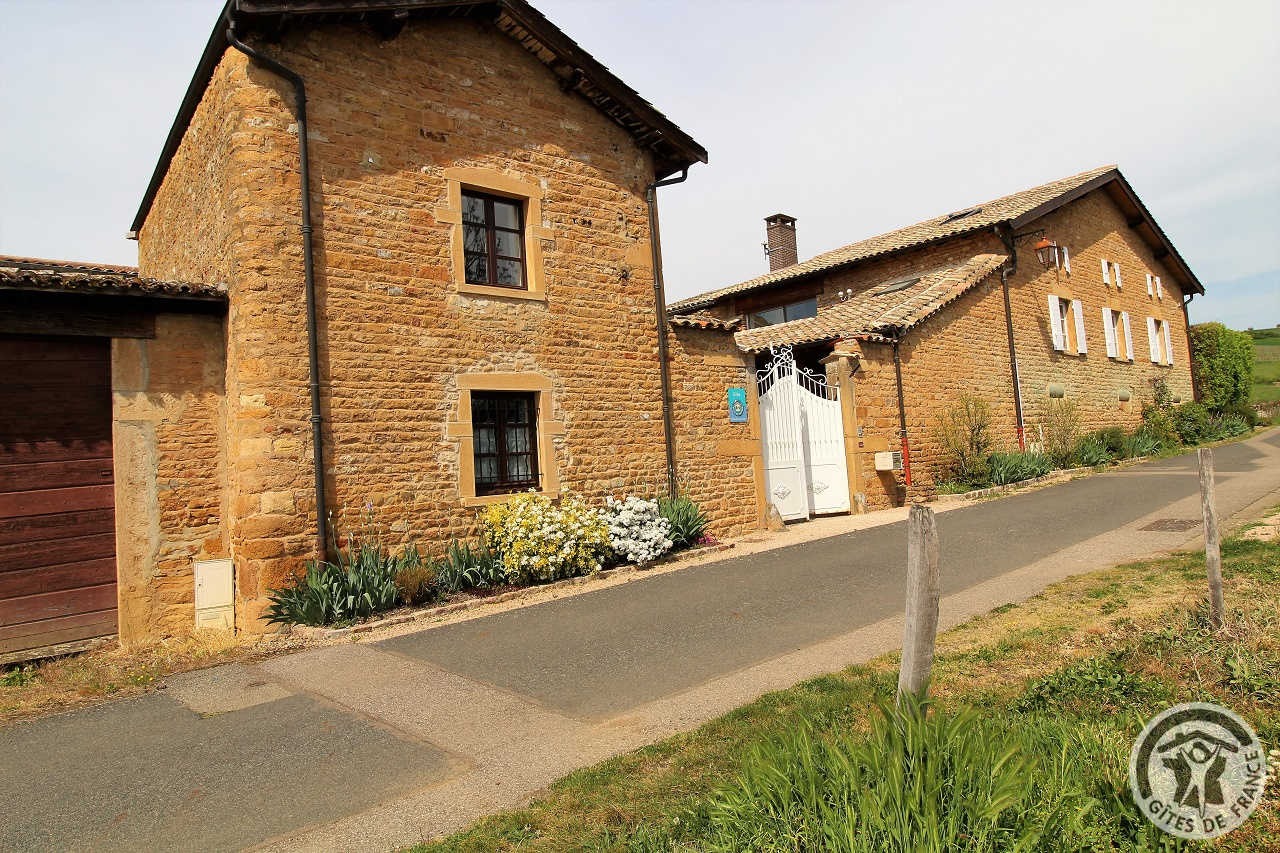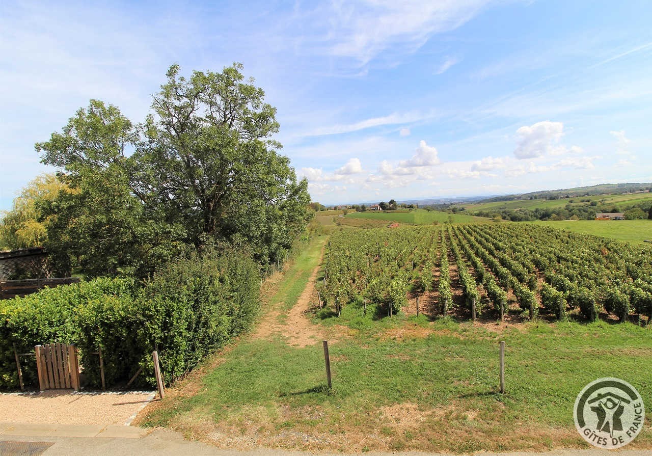 À quelques kilomètres de Villefranche-sur-Saône, gîte avec accès totalement indépendant, situé sur le même terrain que la maison des propriétaires (séparation par une cour intérieure). Ambiance moderne et chaleureuse : matériaux de grande qualité, murs en pierre, poutres apparentes et bel escalier en métal. Au rez-de-chaussée : vaste pièce de jour (espace cuisine intégrée, espace repas, espace salon), petit espace buanderie (fermé). À l'étage : couloir, 2 chambres (1 lit 2 personnes), (2 lits 1 personne). Salle d'eau. Wc. À l'extérieur : jardin privatif non attenant et clos (terrasse en bois, salon de jardin, barbecue), cour commune fermée. Accès possible au jardin commun (2 moutons, grande mare avec canard, poissons, grenouilles). Vue magnifique sur les vignobles et la Plaine de l'Ain. Parking privé. Équipement bébé sur demande (lit, chaise haute, baignoire). Draps, linge de toilette, torchons et kit produits d'entretien fournis gracieusement.