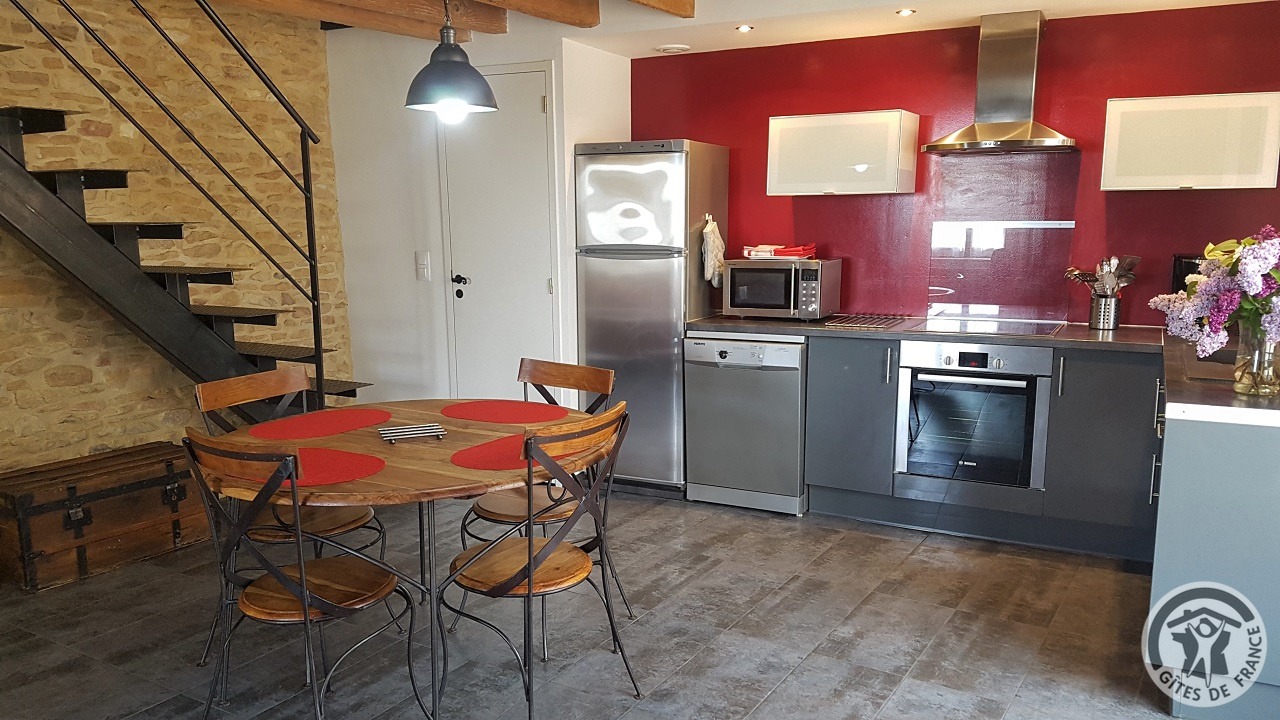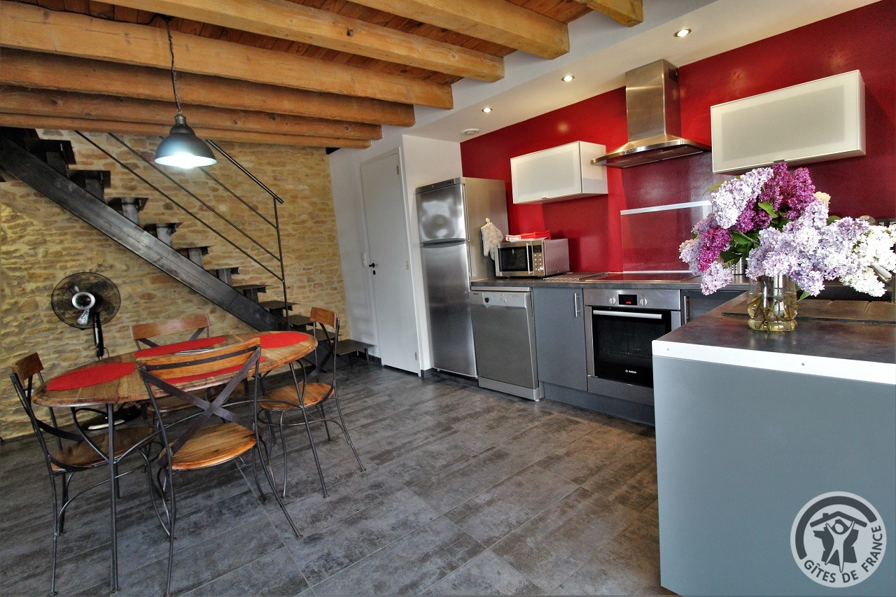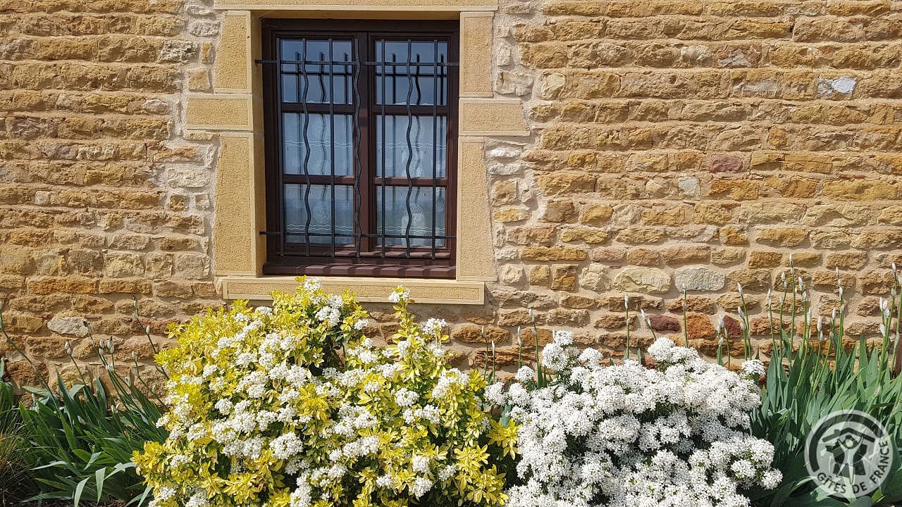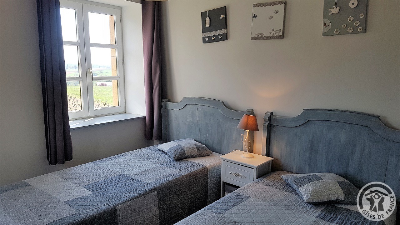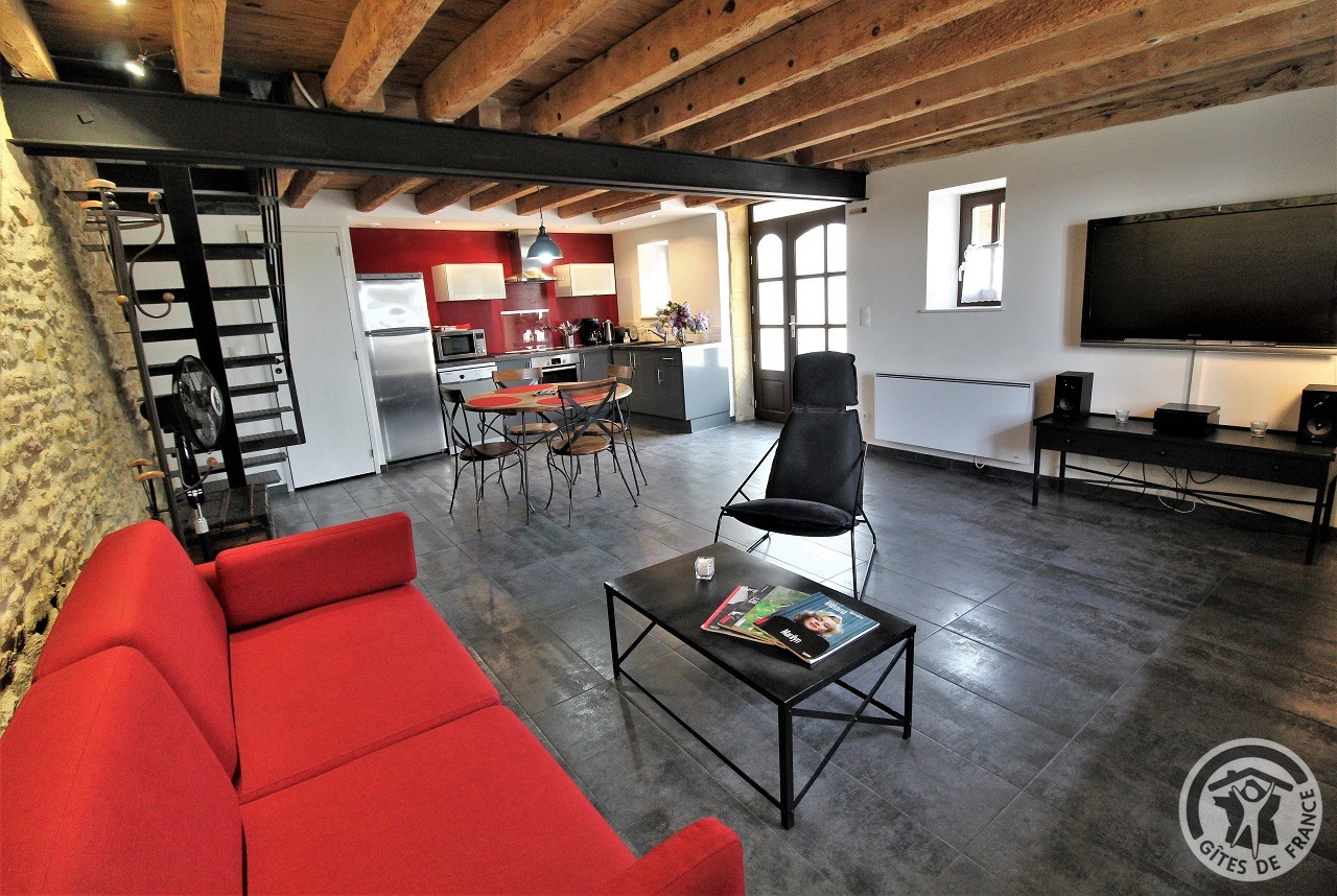 À quelques kilomètres de Villefranche-sur-Saône, gîte avec accès totalement indépendant, situé sur le même terrain que la maison des propriétaires (séparation par une cour intérieure). Ambiance moderne et chaleureuse : matériaux de grande qualité, murs en pierre, poutres apparentes et bel escalier en métal. Au rez-de-chaussée : vaste pièce de jour (espace cuisine intégrée, espace repas, espace salon), petit espace buanderie (fermé). À l'étage : couloir, 2 chambres (1 lit 2 personnes), (2 lits 1 personne). Salle d'eau. Wc. À l'extérieur : jardin privatif non attenant et clos (terrasse en bois, salon de jardin, barbecue), cour commune fermée. Accès possible au jardin commun (2 moutons, grande mare avec canard, poissons, grenouilles). Vue magnifique sur les vignobles et la Plaine de l'Ain. Parking privé. Équipement bébé sur demande (lit, chaise haute, baignoire). Draps, linge de toilette, torchons et kit produits d'entretien fournis gracieusement.