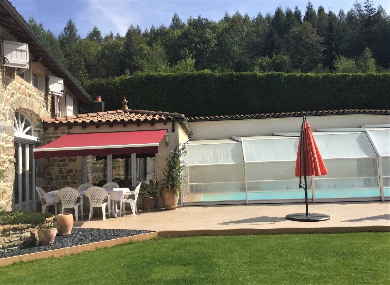 À l'extérieur, grande terrasse privée avec très jolie vue sur la campagne, 2ème terrasse couverte avec table de ping-pong, salon de jardin, transats, parasol, barbecue. Piscine privative (9m X 5m, prof 1.6m), couverte et chauffée (accessible de la mi-avril à mi-octobre), pouvant être découverte en été, local technique pour la piscine incluant 1 Wc. Parking privé. Nombreux départs de balades depuis le gîte. Proximité du Beaujolais et de ses vignobles, de la Saône et Loire (La Clayette, Chauffailles...) et de la Loire (Charlieu, Roanne).