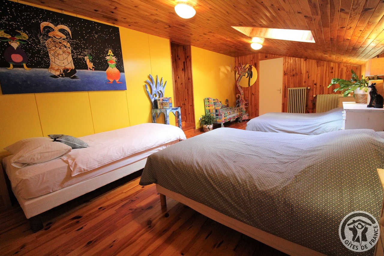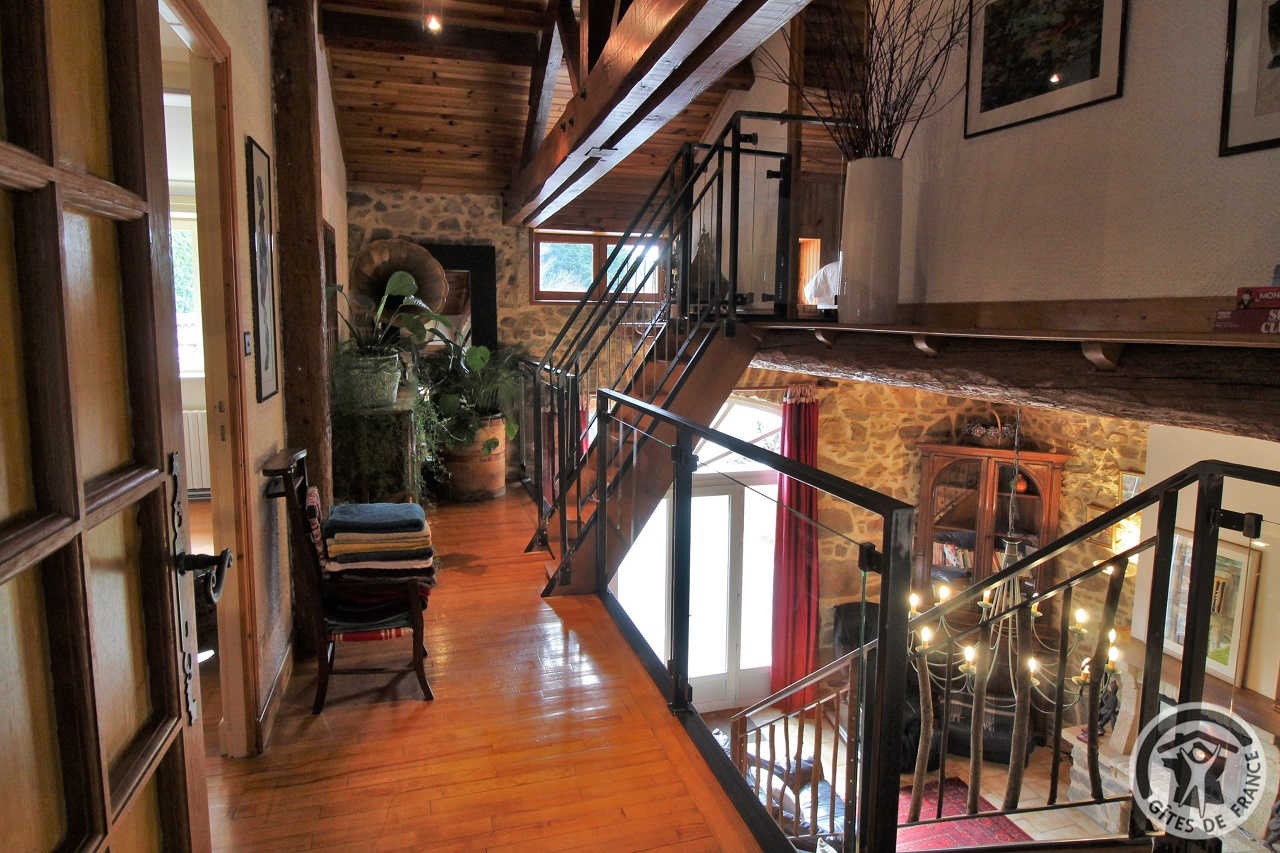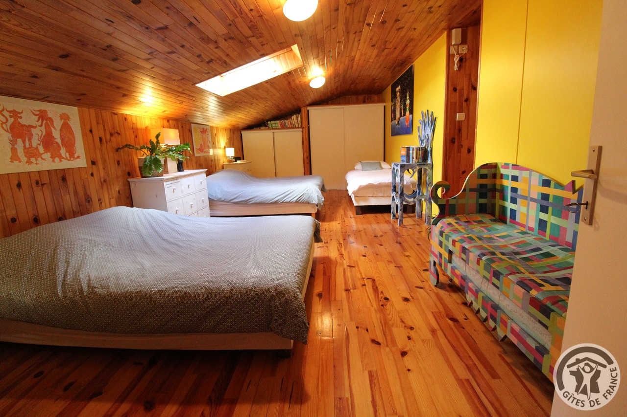 Au rez-de-chaussée : vaste salon avec cheminée. Cuisine toute équipée (réfrigérateur américain) ouvrant sur la salle à manger (TV, lecteur DVD, canapé, babyfoot (haut de gamme), accès direct à la piscine). Salle de bains. Buanderie avec Wc. À l'étage : mezzanine desservant les 4 chambres. La chambre 'Vue sur jardin' est équipée de 1 lit en 180 cm (aménageable en 2 lits de 90 cm selon besoin), la chambre 'Dortoir' avec sanitaires privés (douche, 2 lavabos et Wc) peut accueillir jusqu'à 5 personnes (2 lits 2 personnes et 1 lit 1 personne), la chambre 'Orange' incluant un lavabo dispose d'un lit 2 personnes (dimension 140 X 190 cm) et enfin la chambre 'Japonaise' (accessible par un escalier à pas japonais) est dotée d'1 lit 2 personnes, 1 lit 1 personne et d'un lavabo. Salle de bains avec baignoire, lavabo et Wc.