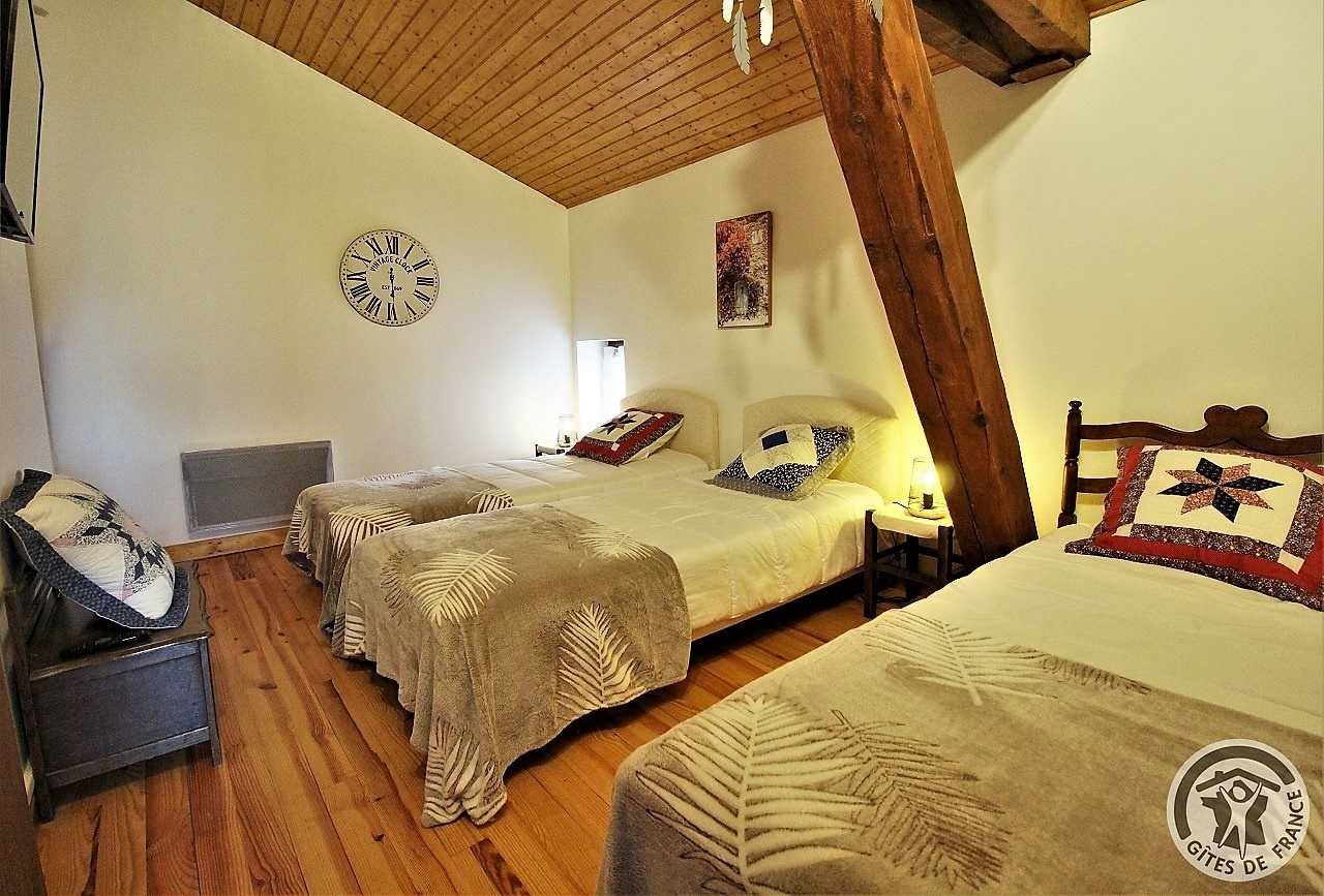À l'étage : grand salon avec TV et bibliothèque (possibilité couchages supplémentaires dans 2 canapés convertibles avec supplément de 40€/nuit/personne à régler auprès des propriétaires). 2 chambres (1 chambre double avec 1 lit de 140 cm, 1 chambre triple avec 3 lits de 1 personne). Salle d'eau. Wc indépendant avec lave-mains. Lit bébé et chaise haute sur demande.