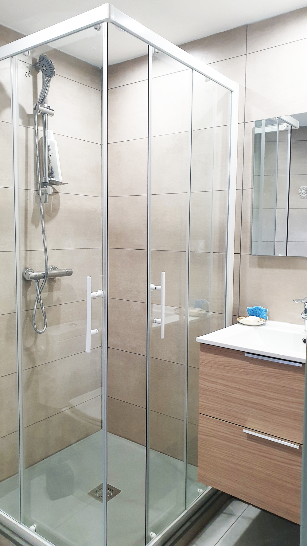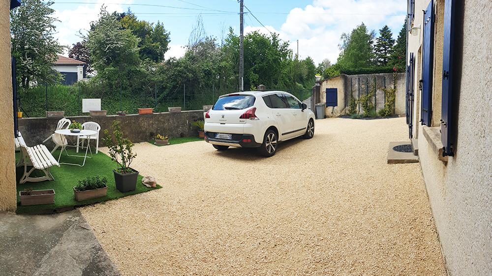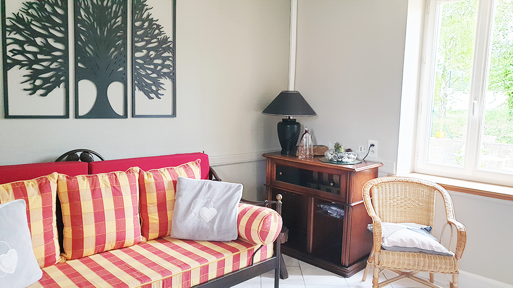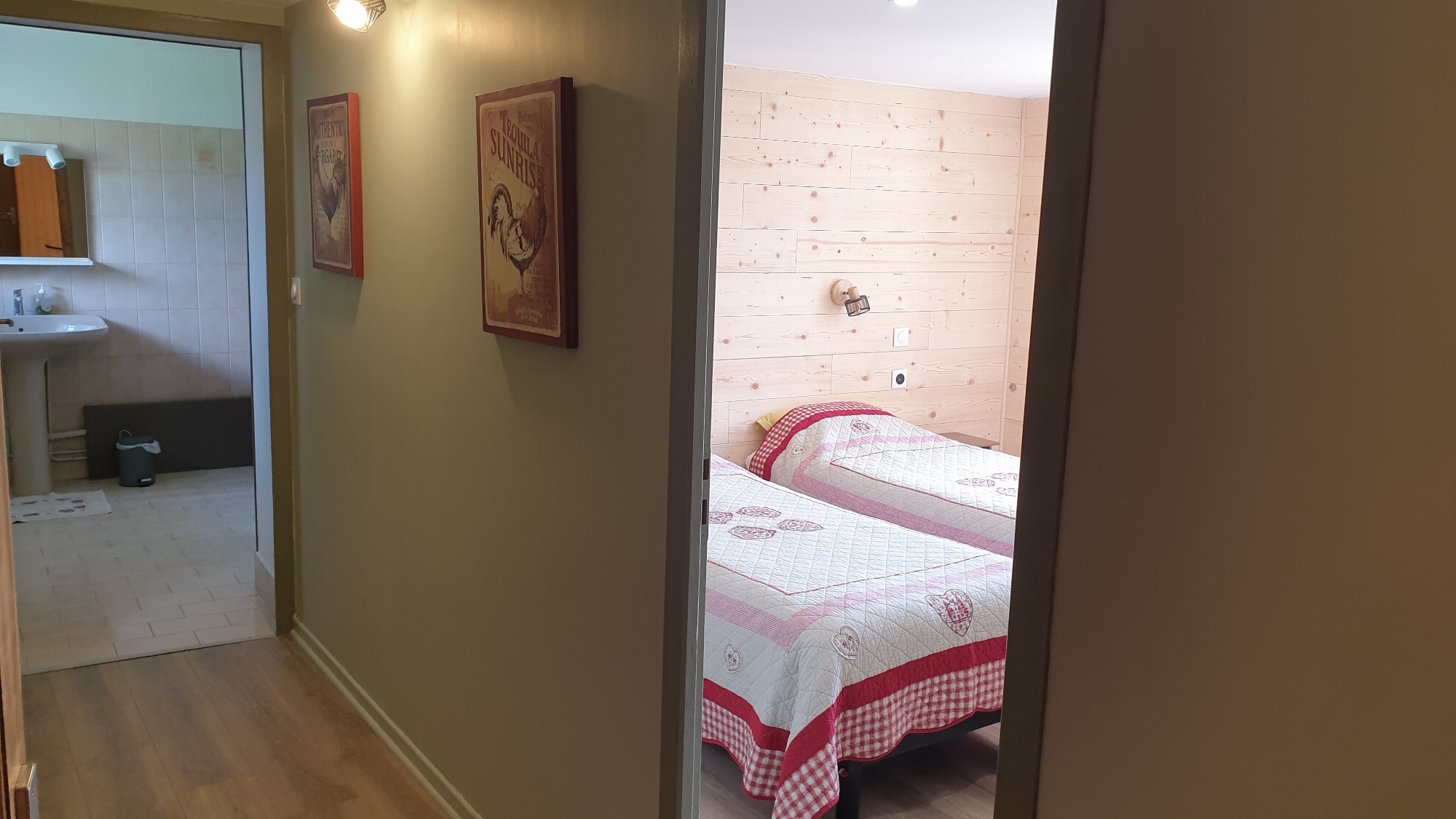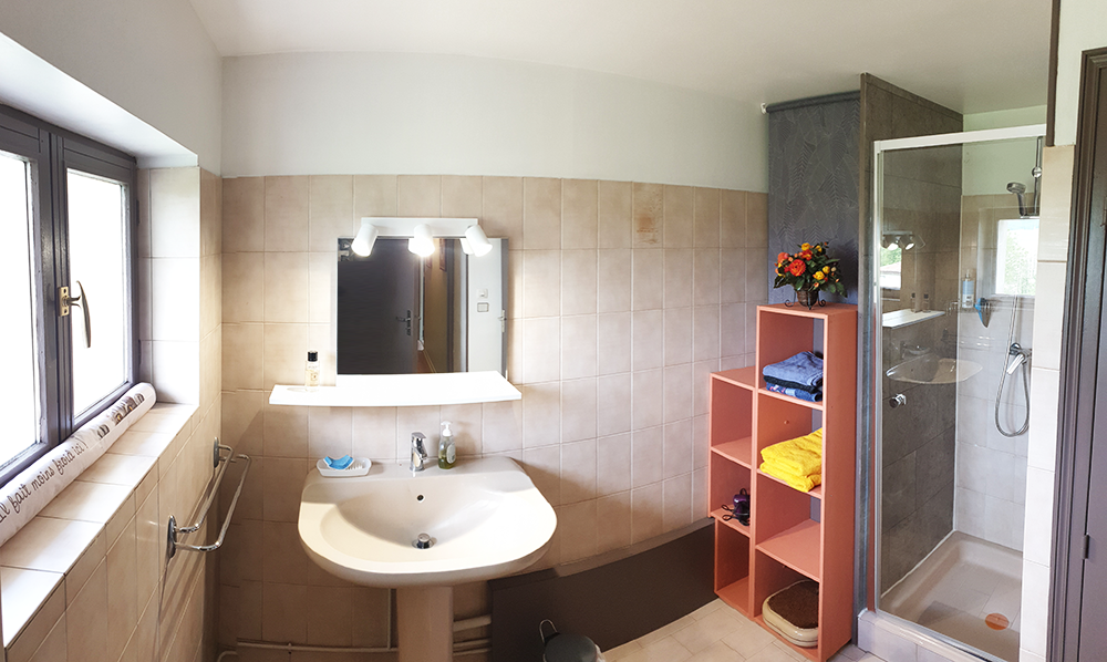 A l'étage, vous trouverez 2 chambres équipées chacune d'une salle de bain, d'un WC et d'une table de travail. Télévision dans le salon et dans chaque chambre. L'accès à l'étage se fait par un escalier un peu raide. Parking privé dans cour fermée.