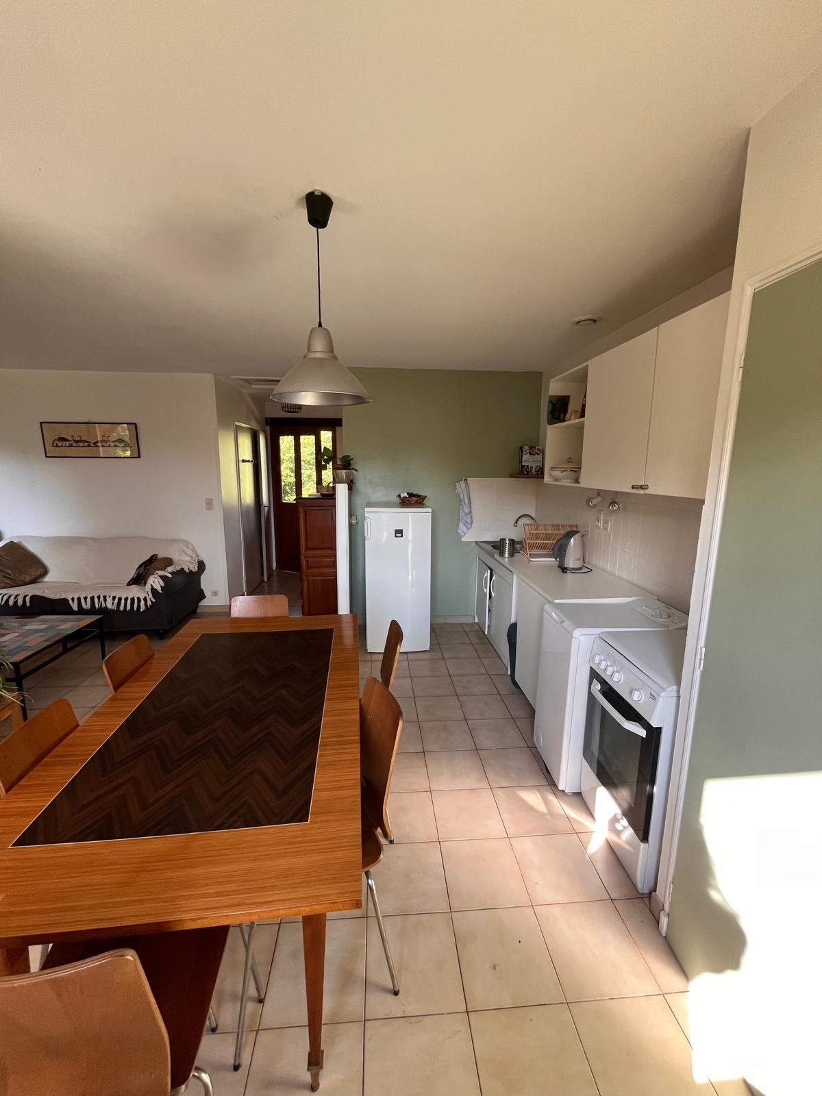 La pièce principale est composé d'un coin cuisine tout équipée (micro-onde, cafetière, cuisinière, four, vaisselle...), une table conviviable et d'un coin salon avec un tv.