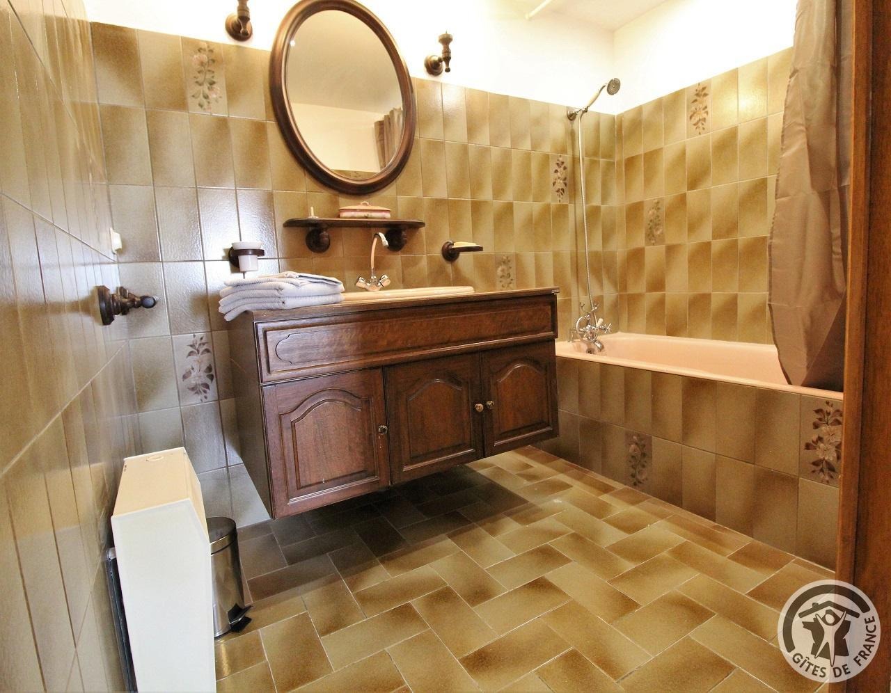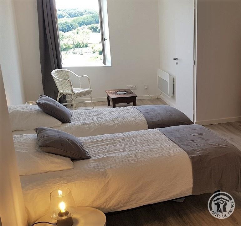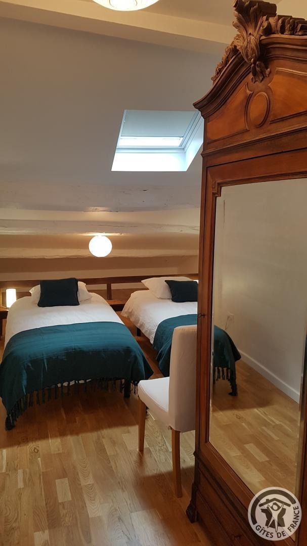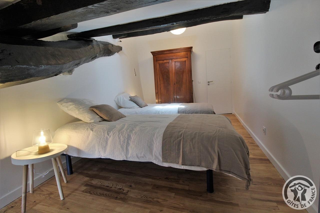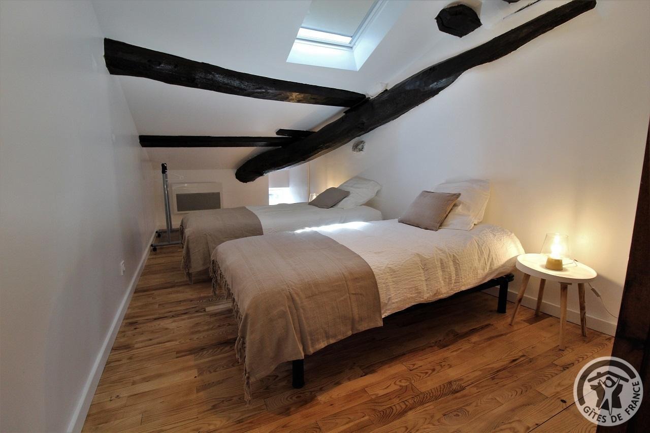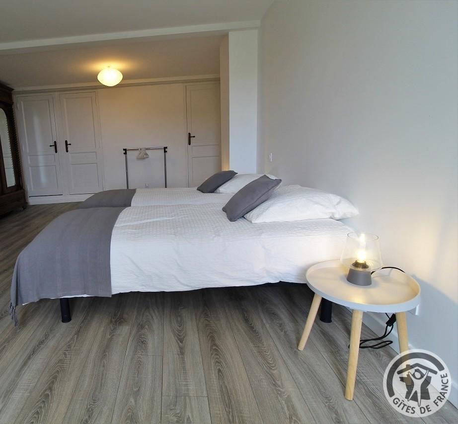 Étage : 1 grande chambre (2 lits de 1 personne, possibilité couchage supplémentaire avec supplément : 20 €/pers./nuit) , sanitaires privés (salle de bains, WC indépendant), dégagement, vaste salon avec balcon, TV.