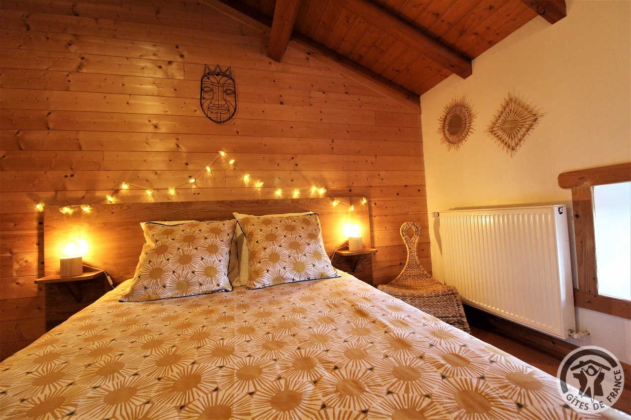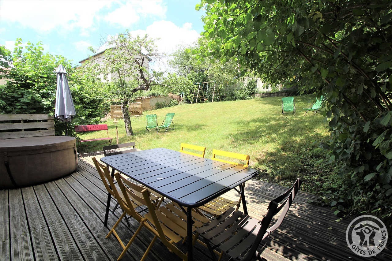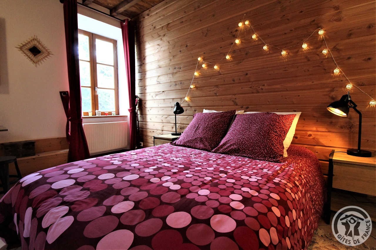 L'accès se fait sur le devant de la maison, de plain-pied (1 marche) puis le gîte donne au 1er étage sur une terrasse et un vaste jardin arboré, clos et privatif sans vis à vis. Au rez-de-chaussée : hall d'entrée (lave-linge et sèche linge, placard mural). 1 chambre (1 lit 2 personnes) avec sa salle de bains et wc privatifs. Au 1er étage ayant un accès direct de plain pied sur les extérieurs : vaste pièce de jour (espace cuisine, espace repas et espace salon avec TV et cheminée). Au 2ème étage : espace détente (TV), 2 chambres (1 chambre 1 lit 2 personnes, 1 chambre 1 lit superposé), salle d'eau incluant Wc. Équipement bébé sur demande (lit, chaise haute, baignoire, matelas à langer). Tout le caractère de l'ancien a été conservé (parquet d'époque, poutres apparentes), jolie décoration. À l'extérieur : terrasse en bois avec spa (pour 2 personnes), salon de jardin, banc, chaises longues, barbecue. Jeux d'enfants (portique, balançoire à bascule). A proximité immédiate, la propriétaire propose un autre gîte de 4 personnes dans une maison en bois complètement indépendante (possibilité de louer les 2 hébergements pour un total de 10 personnes). Dans le village, plusieurs petits commerces (boulangerie, boucherie, épicerie).