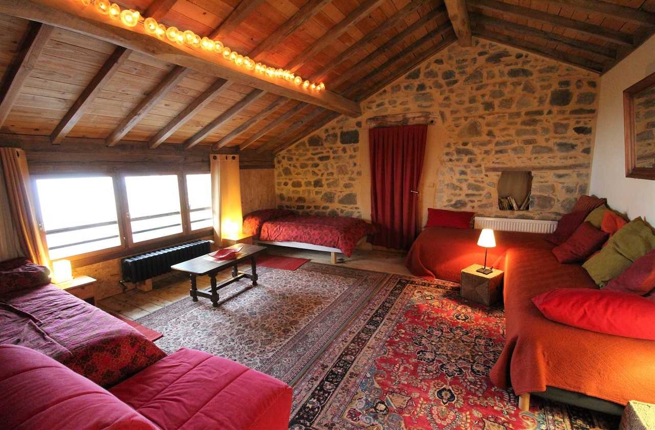 Un site féérique au coeur des Monts du Beaujolais ! Envie de vous ressourcer, isolés en pleine nature dans un cadre magnifique et préservé ? Et de retrouver calme et sérénité face à un panorama exceptionnel ? Nous vous accueillons avec chaleur et simplicité, dans notre nid douillet restauré avec un engagement écologique sincère, accroché au cœur de la prairie, entre vignes et forêts, à 615 m d'altitude, avec une vue dominante à couper le souffle. Chambres spacieuses, déco et literie très soignées. Table d'hôtes partagée, avec produits bio ou fermiers, issus de notre jardin ou de chez nos amis producteurs voisins. Chaque chambre est équipée de sanitaires privés, terrasse et accès direct sur l'extérieur. A l'étage, mais avec accès de plain-pied : 1 chambre familiale (6 personnes, 50 m²). Au rez-de-chaussée , 2 chambres (3 personnes dans chacune - couchages modulables 2 X 90 ou 1.80, 25 m²), et à l'étage de la maison des propriétaires, 1 chambre en duplex (4 personnes, 23 m²). Salon, bibliothèque, grande véranda. Grand jardin agrémenté de bassins. A notre table d'hôtes, cuisine saine et généreuse, parfois végétarienne, toujours gourmande. Nombreux départs de randonnées (pédestres et VTT) sur place. Maison non fumeur. Réduction à partir de la 2ème nuitée consécutive.