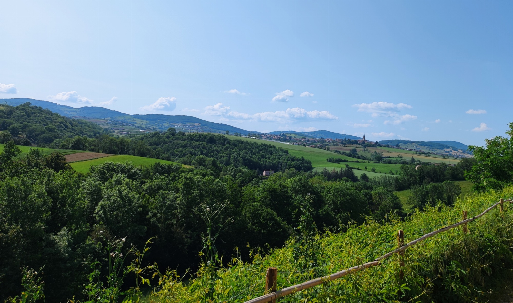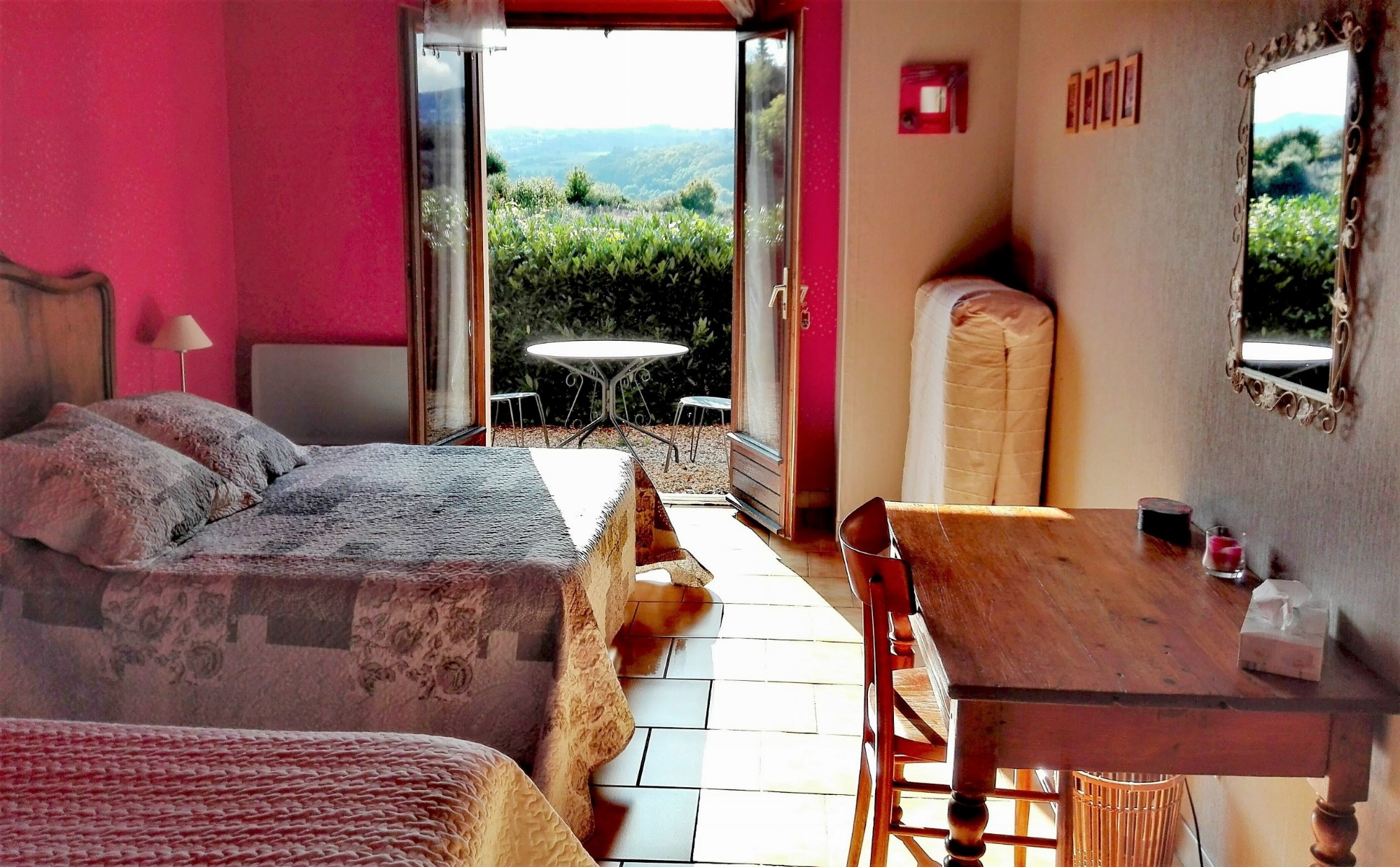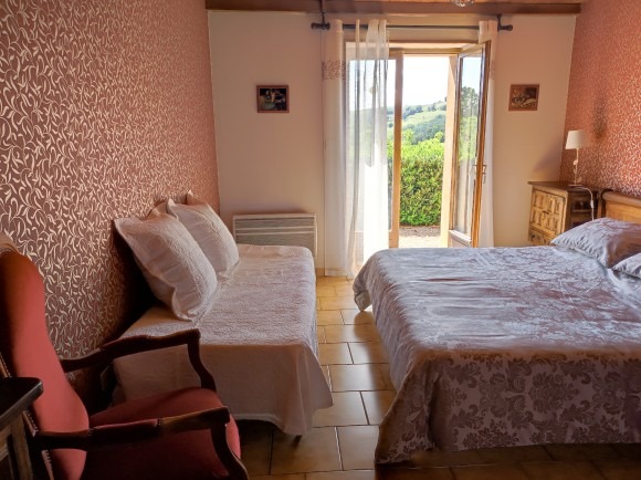 Vous avez accès directement à la terrasse où vous disposez d'un salon de jardin privatif avec une vue panoramique sur les Monts du Lyonnais.