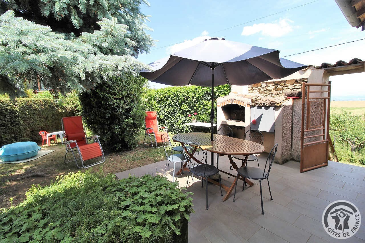 A la colline fleurie, Jean-Claude et Odile sont heureux de vous accueillir dans un cadre charmant et apaisant. Le gîte est aménagé dans une aile d'une ancienne ferme rénovée et superbement fleurie typique des Coteaux du Lyonnais, en face de la maison des propriétaires, avec accès indépendant. Vue panoramique sur la chaîne des Alpes et du Mont Blanc par temps clair. Idéal pour les familles avec jeunes enfants et randonneurs. Rez-de-chaussée : sanitaires (wc), hall, buanderie avec tout le nécessaire pour l'accueil des bébés, local technique (lave-linge, douche supplémentaire). Séjour (coin salon avec cheminée à foyer fermé ; coin-repas), cuisine ouverte et donnant par une porte-fenêtre sur la terrasse, toute équipée. 1 chambre (2 lits 1 personne). Etage : Salle de bains, 2 chambres mansardées (1 lit 2 personnes dans chacune). Chauffage central. Lits faits à l'arrivée et linge de maison fourni. Jardin privatif aménagé, fleuri et très ombragé (salon de jardin, barbecue, petit salon de jardin pour les enfants, bac à sable), petit pré en contrebas, clos (accès par des escaliers) avec portique, jeu de boules. Chaises longues, parking pour 2 voitures, vue panoramique. Sentiers balisés à proximité du gîte ainsi que culture et vente de plantes médicinales et aromatiques en culture biologique. Séjour dans le cadre d'un déplacement professionnel : 3 personnes maximum.