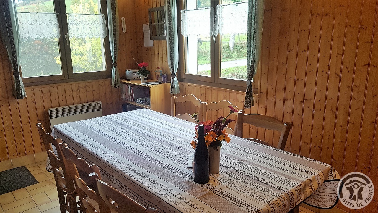 A l'étage : séjour, coin cuisine (m.-ondes, congélateur), coin détente. Salle de bains, wc indépendant. Etage : 2 ch. (1 ch. 1 lit 2 pers., 1 ch. 3 lits 1 pers. dont 1 superposé), une petite mezzanine (1 lit enfant). Lit bébé. Chauffage électrique, bois fourni. Tél. mobile avec caution. Terrain aménagé non clos, salon de jardin, barbecue, parasol, chaises longues, boules de pétanque. Possibilité vente produits fermiers, visite de l'exploitation. A 500 m, plan d'eau aménagé (pêche, camping, aire pique-nique), ombragé.