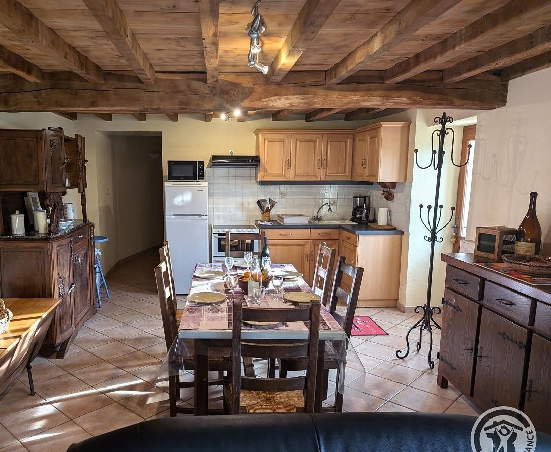 En pleine nature (accès par un chemin non goudronné et carrossable), pour un week-end ou un séjour, découvrez ce gîte de caractère aménagé dans un ancien corps de ferme comprenant aussi l'habitation des propriétaires, à la sortie d'un petit hameau. Vous apprécierez sans nul doute l'environnement calme entre forêts, prés et petite rivière. L'accès est indépendant sans aucun vis à vis. De nombreuses promenades sont à faire au départ du Gîte. Etage : accès par un balcon dans vaste pièce de jour, coin cuisine, coin-salon. 2 chambres (1 chambre 1 lit 2 personnes, 1 chambre 2 lits superposés pour 4 personnes, lit bébé). Salle d'eau, wc. Chauffage central. Cave à disposition, terrain privatif aménagé non clos, portique. Chemin d'accès non goudronné. Supplément animal : 5 €/jour/animal.