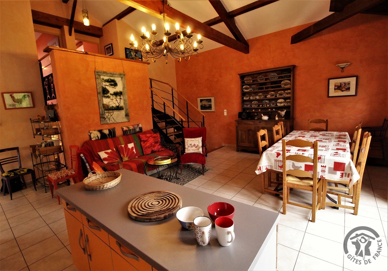 Il se situe dans un bâtiment attenant à la maison des propriétaires, de jeunes retraités, qui vous réserveront le meilleur accueil.. Gîte non adapté aux soirées festives en raison de voisinage proche, merci de contacter la centrale de réservation . À l'étage (escalier extérieur) : entrée dans pièce de jour (espace cuisine, espace repas et espace salon) ouvrant sur un balcon (vue sur le jardin) et sur une grande terrasse donnant sur la cour intérieure. 2 chambres en contrebas (1 chambre avec 2 lits de 1 personne pouvant être aménagés en grand lit et 1 lit superposé, 1 chambre avec 3 lits de 1 personne).