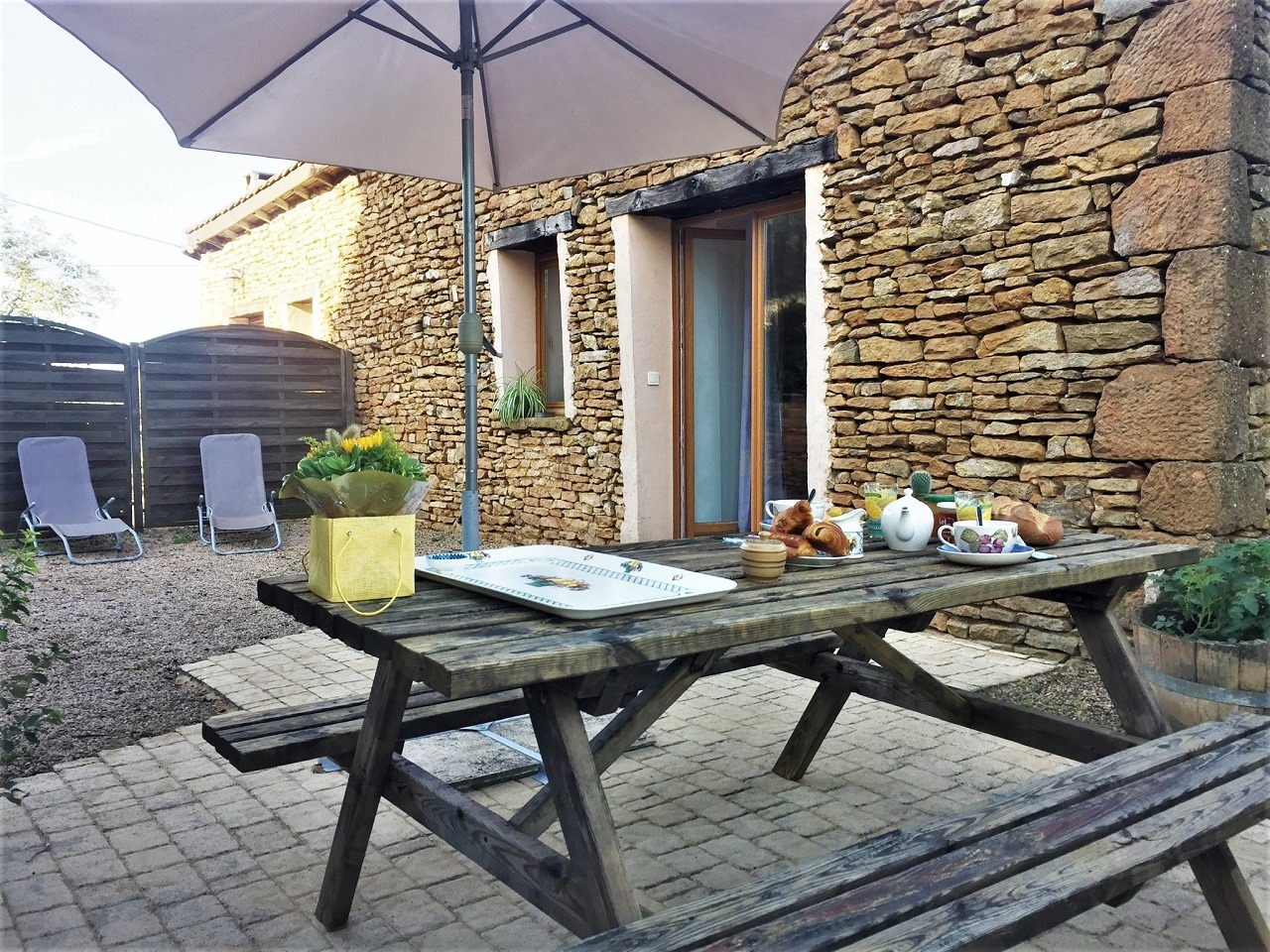 Rez-de-chaussée : pièce de jour/ coin-cuisine (four micro-ondes)/ coin-salon. Chauffage bois et électrique. Etage inférieur : 2 chambres (1 ch. 1 lit 2 pers., 1 ch. 3 lits 1 pers. dont 2 superposés). S. d'eau/wc. Terrasse, terrain avec jeu de boules commun avec le second gîte. Salon de jardin, barbecue, parasol, chaises longues, parking. Idéal pour un séjour, déplacement professionnel en Beaujolais. Dégustation et vente de vins. Supplément par animal : 7 euros/jour.