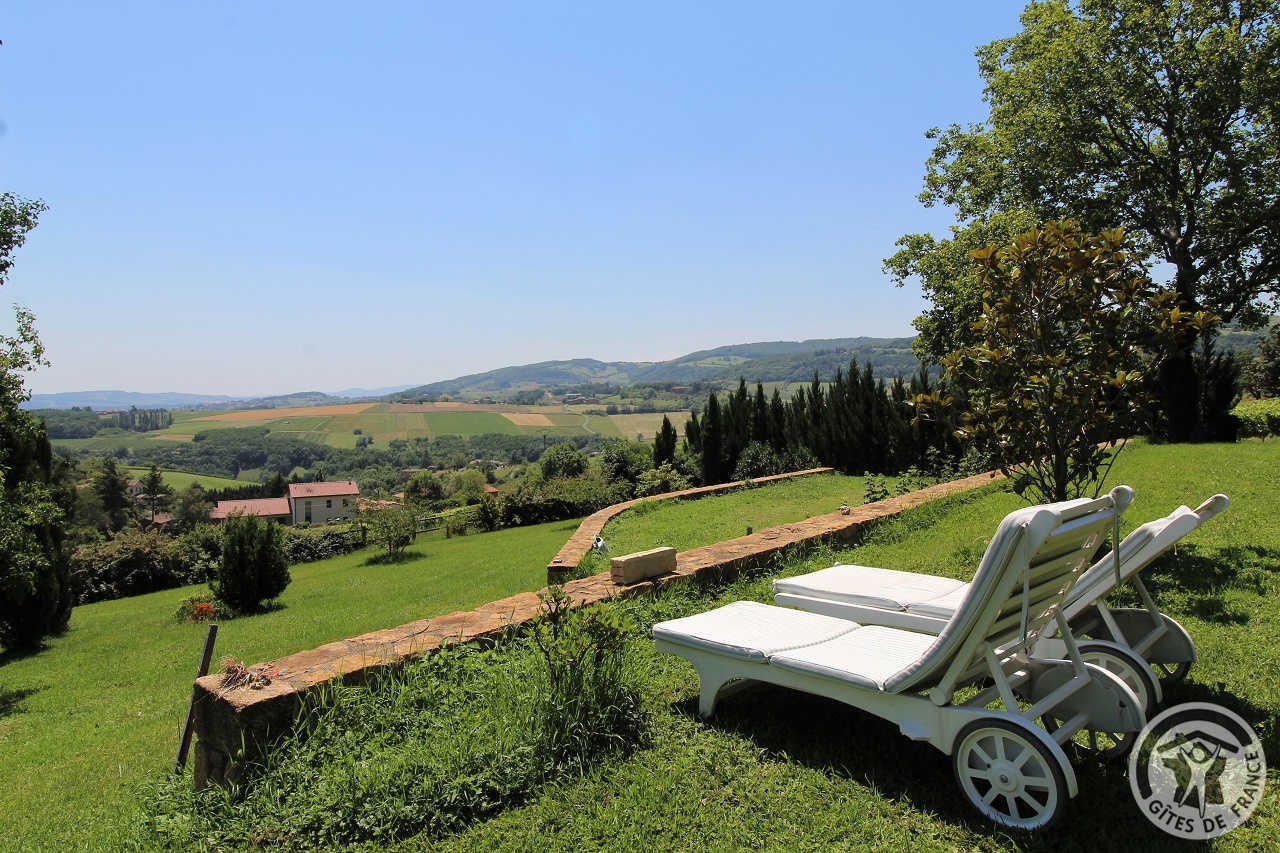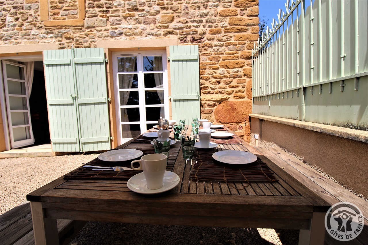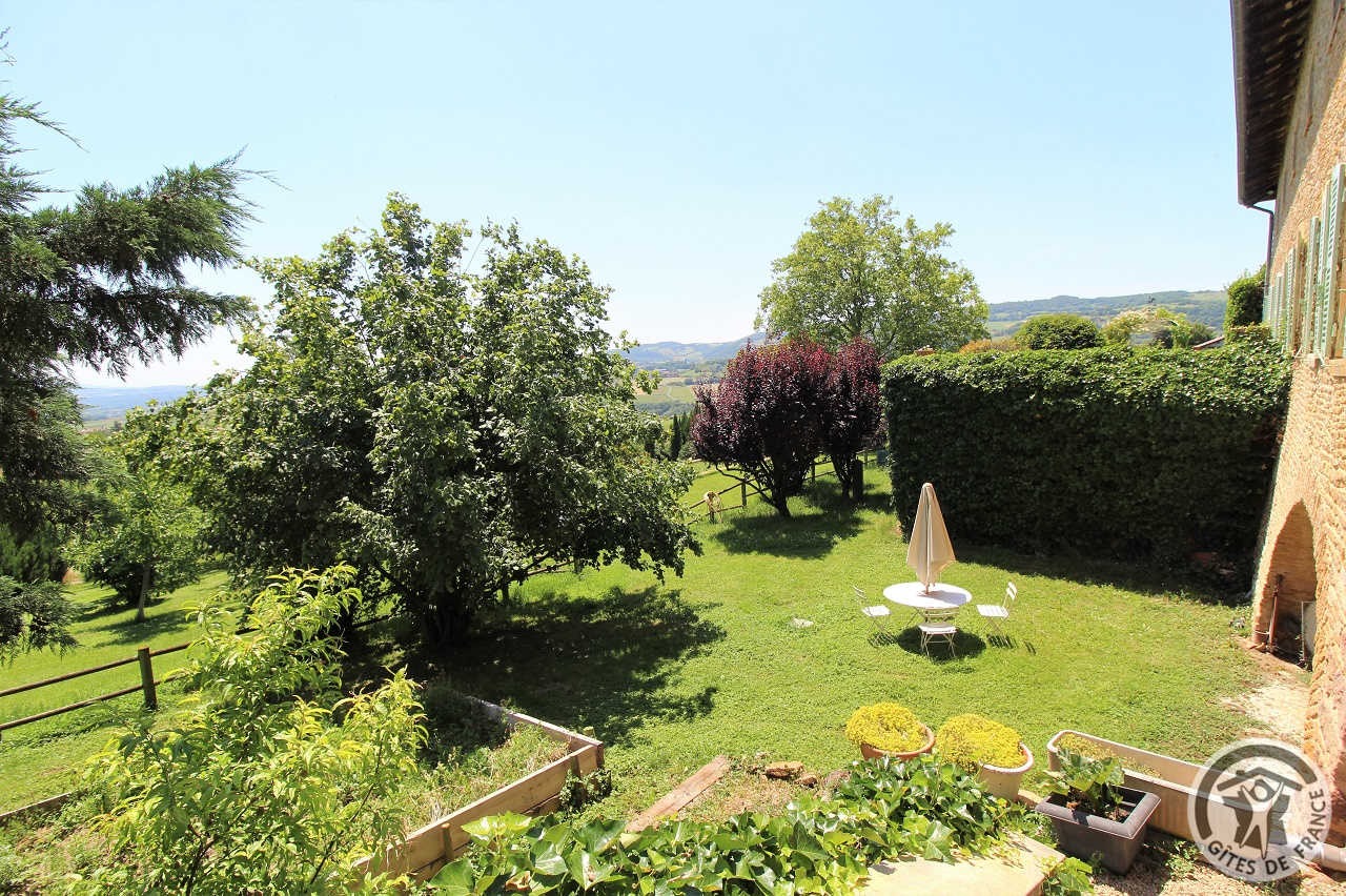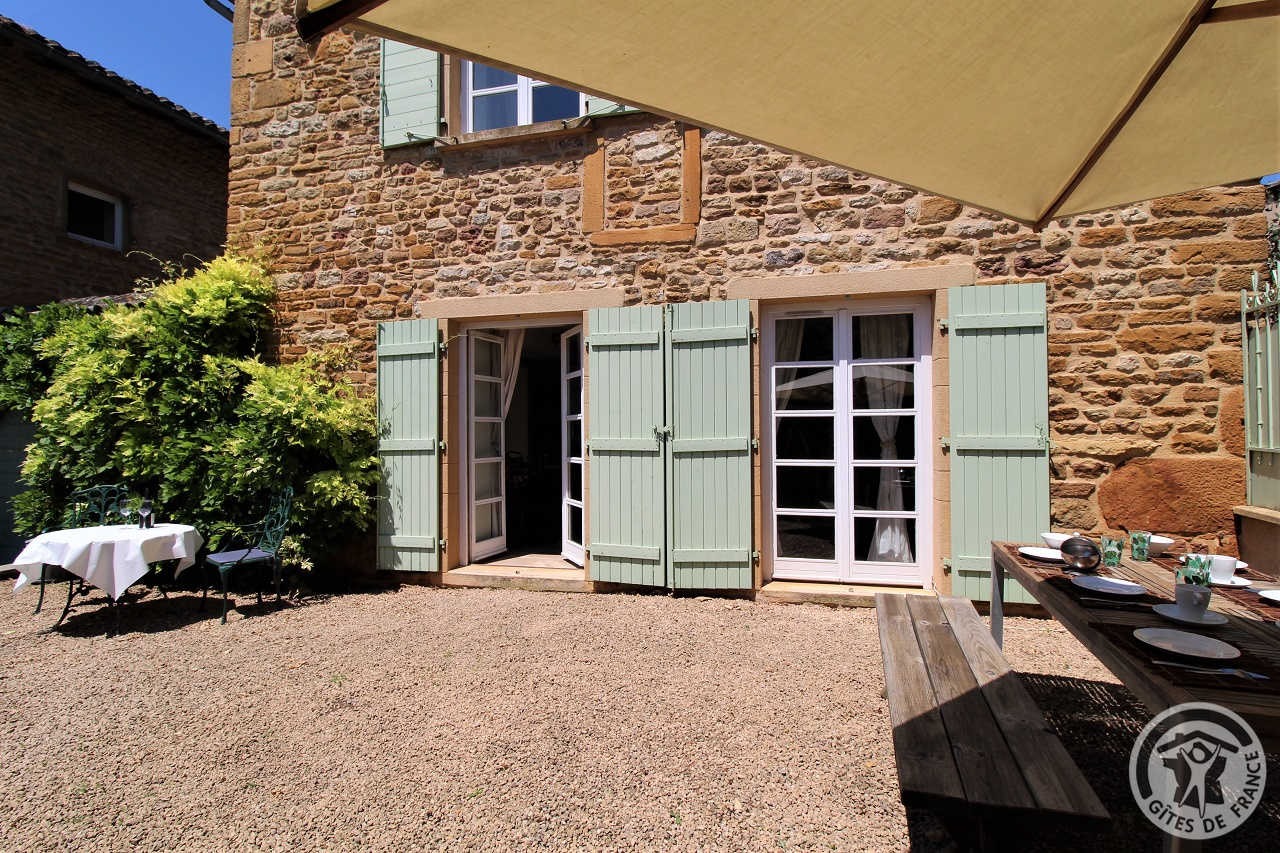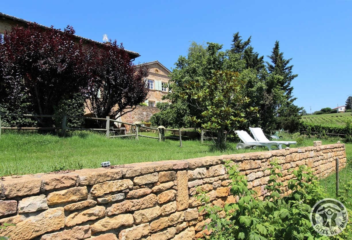 À proximité de Lyon et de Villefranche-sur-Saône, ce très beau gîte est situé au Domaine de Fond Moiroux, une vaste propriété comprenant également un logement occasionnel et des dépendances viticoles. Sylvie et Bertrand, les propriétaires sont viticulteurs. Les hôtes intéressés pourront (sur demande) déguster les vins du Domaine et visiter l'exploitation. Accès à l'hébergement par la cour commune ou par la terrasse privative (portail). Rez-de-chaussée : vaste pièce de jour (espace repas, espace salon avec cheminée et TV écran plat). Cuisine ouverte indépendante. Dégagement surélevé comprenant 1 Wc (avec lave-mains) et 1 placard fermé avec lave-linge. À l'étage : espace détente (canapé, table basse), 3 chambres doubles avec grands placards muraux et parquets d'époque (1 lit 180 X 200 cm, salle d'eau privative incluant Wc), (1 lit 160 X 200 cm), (1 lit de 140 x 190 cm). 2 salles d'eau. 1 Wc indépendant. À l'extérieur : terrasse privée et ombragée avec salons de jardin et barbecue, vue imprenable. Des escaliers conduisent, en contrebas, au jardin ombragé et partagé, chaises longues, salon de jardin, vue magnifique. Jeu de pétanque à disposition. Draps et linge de toilette fournis gracieusement, ménage de fin de séjour compris dans les prix de location.