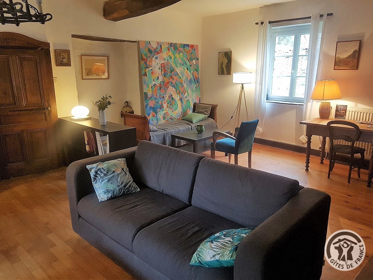 L'accès au gîte se fait par un petit escalier en pierres menant à la terrasse. Intérieur de caractère : murs en pierres, tomettes ou parquet, poutres apparentes et mobilier en bois (armoire, horloge, piano...).
