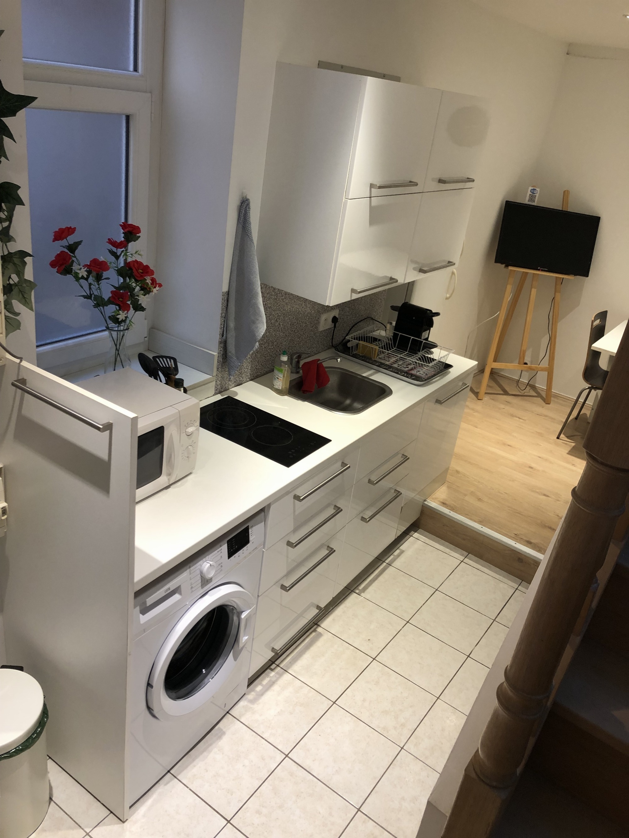 Ce duplex climatisé est composé d’une cuisine équipée, d’un coin repas avec TV, d’une petite salle d’eau/WC et à l’étage se trouve une chambre sous velux ( avec volet roulant) avec lit double, TV ainsi qu’un espace bureau.