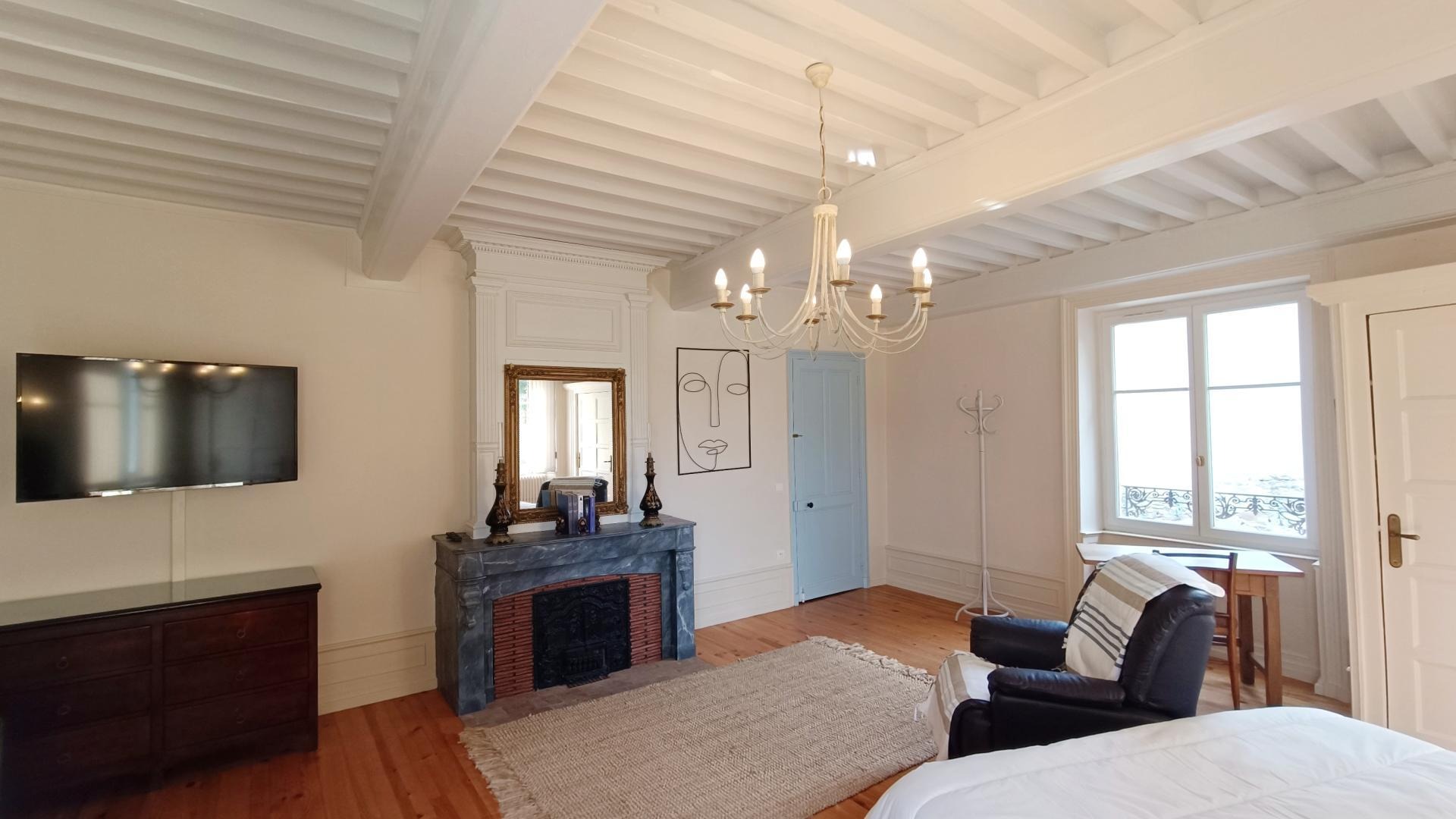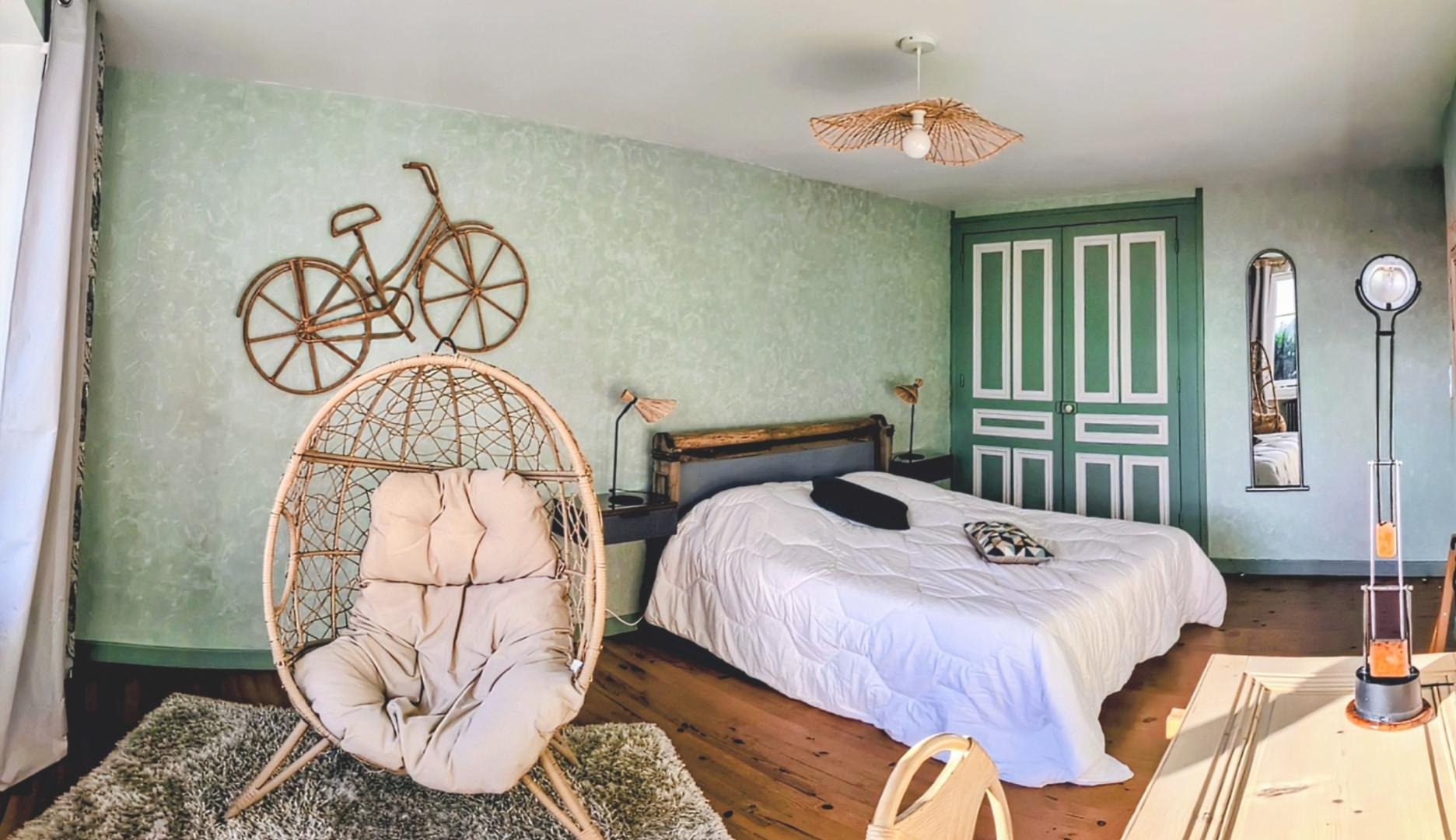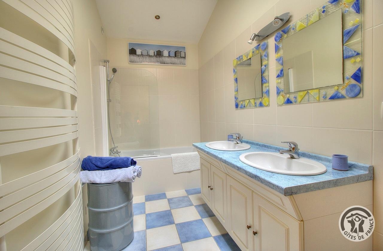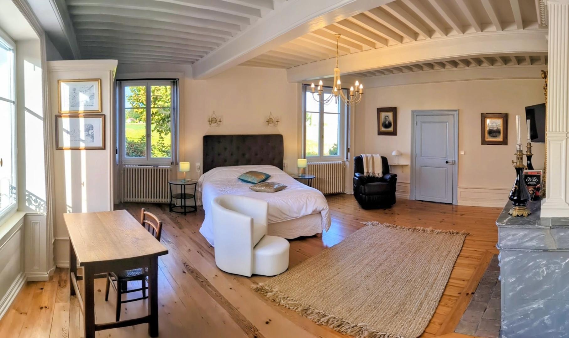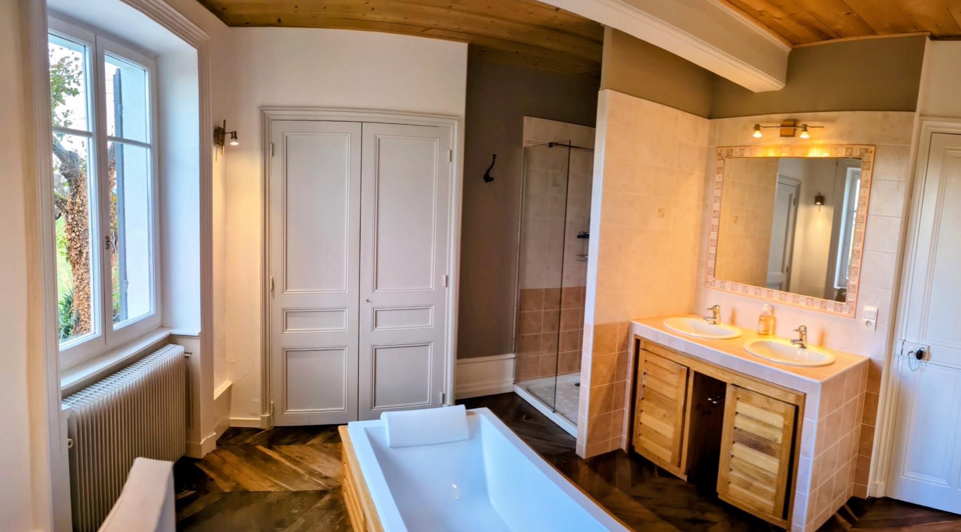 Arrivée au 1er étage, vous traversez une antichambre avec bibliothèque pour ensuite retrouver 2 chambres : 1 chambre familiale pour 3 personnes (1 lit double et 1 lit simple) ; 1 suite avec 1 lit double et une vaste salle de bain (baignoire, douche et wc) accessible par la suite ou par une entrée indépendante.