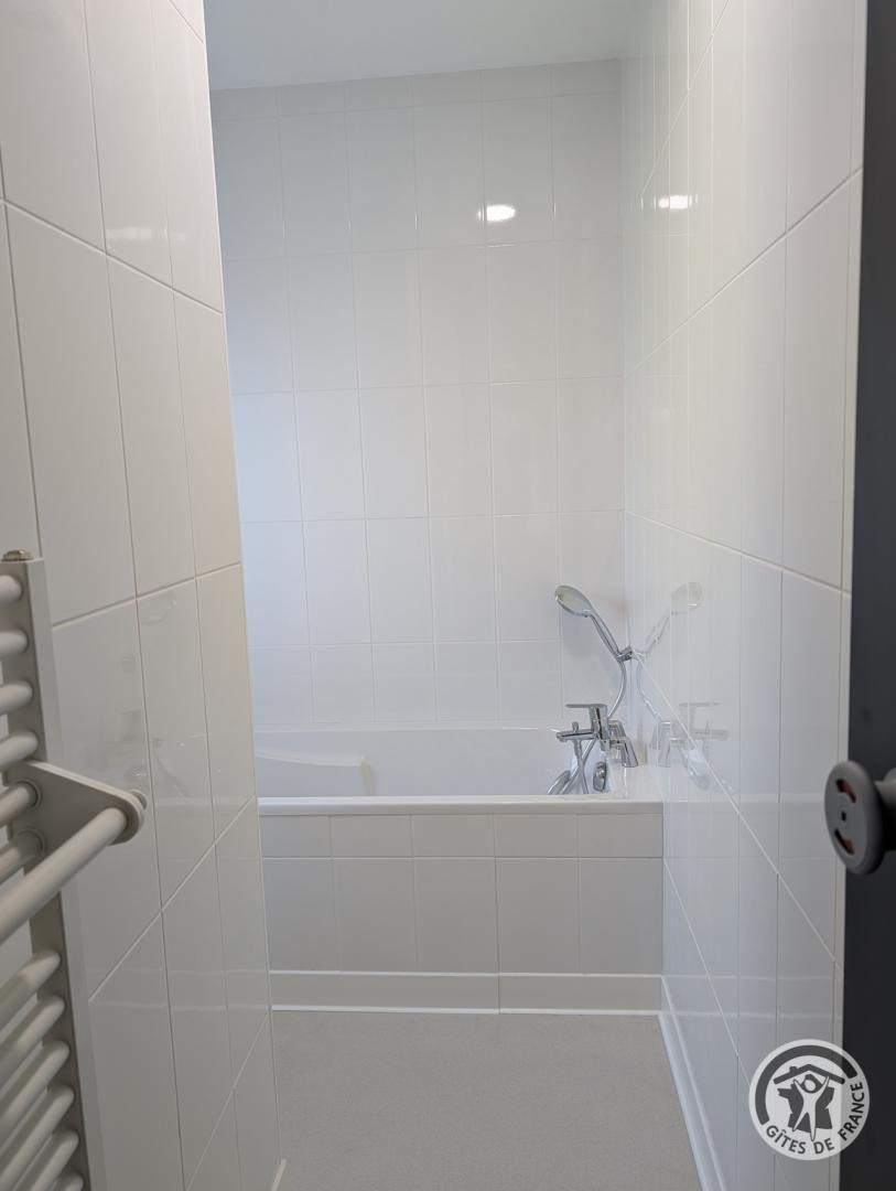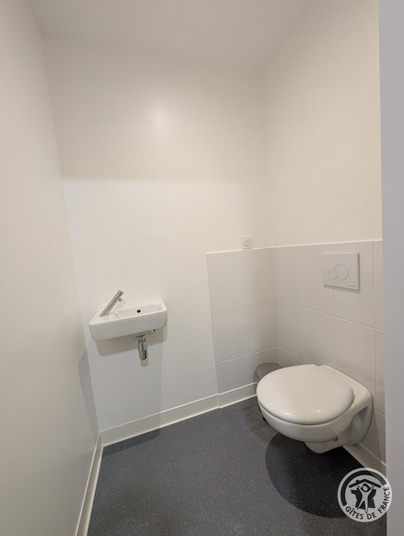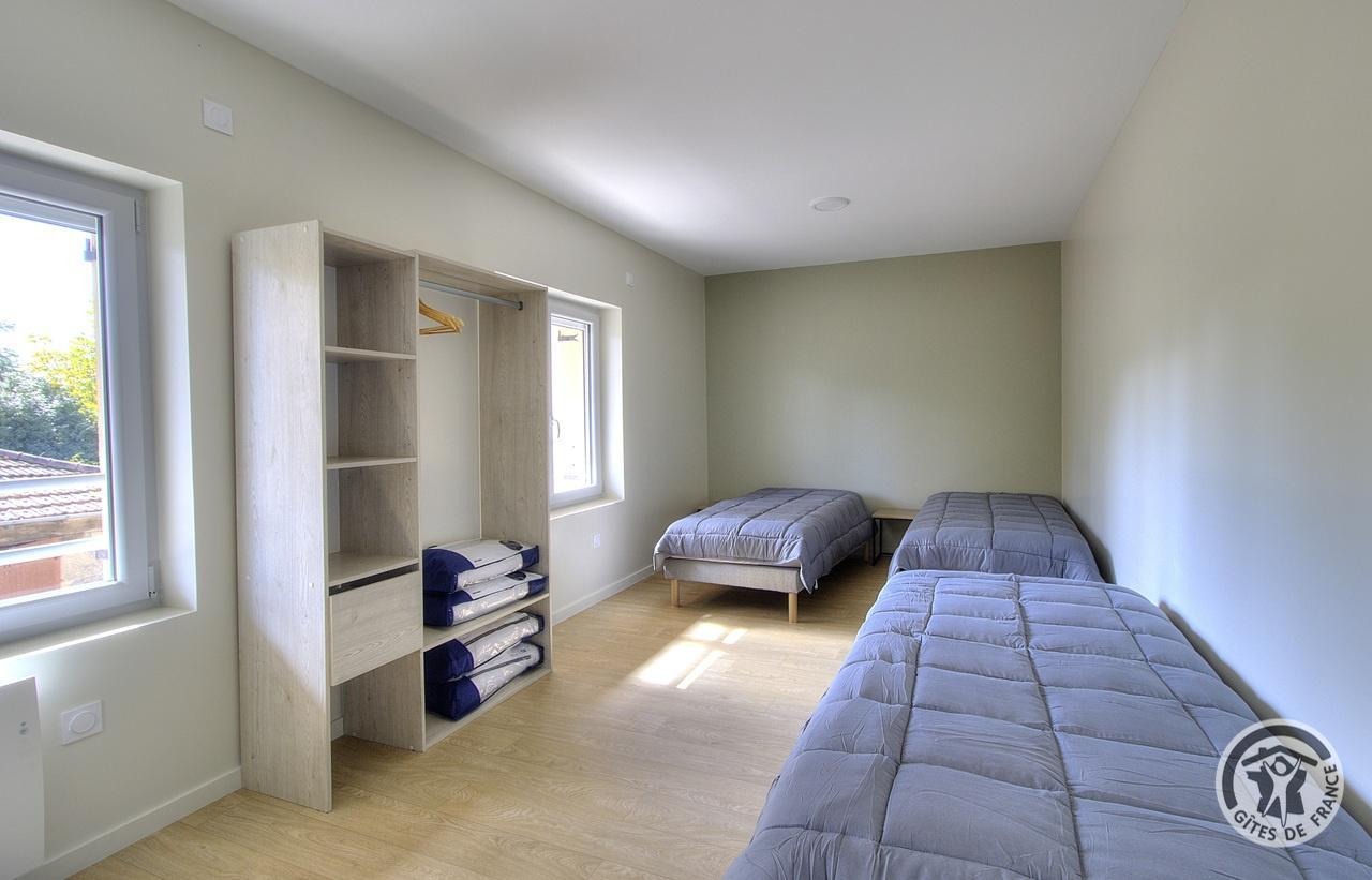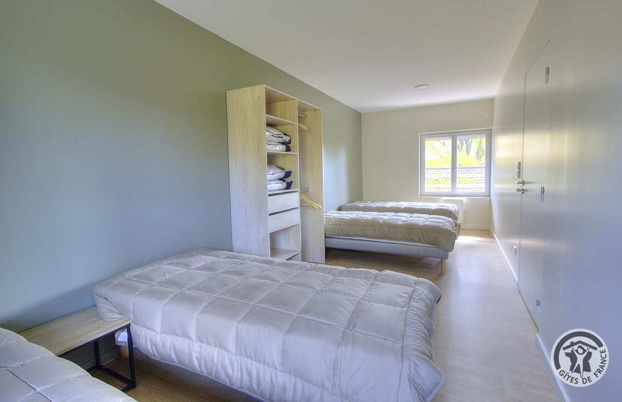 Puis 2 chambres familiales pour 4 personnes (4 lits simples dans chacune), 1 salle d'eau avec 1 douche, 1 wc et 2 lavabos. 1 salle d'eau incluant 2 lavabos, 1 salle de bains avec 1 baignoire, 1 douche et 1 wc.