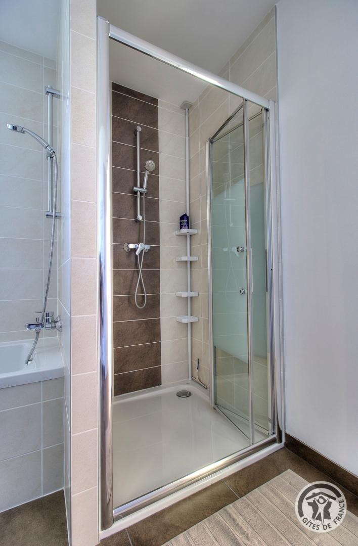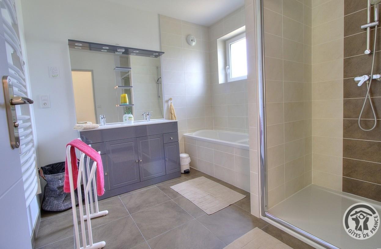 À l'étage, trois chambres accueillantes permettent de loger confortablement jusqu'à 5 personnes (avec possibilité d'ajouter un matelas supplémentaire) : une chambre double, une chambre à deux lits simples et une chambre individuelle. La salle de bains familiale offre baignoire, douche, double vasque et wc séparé pour votre confort.