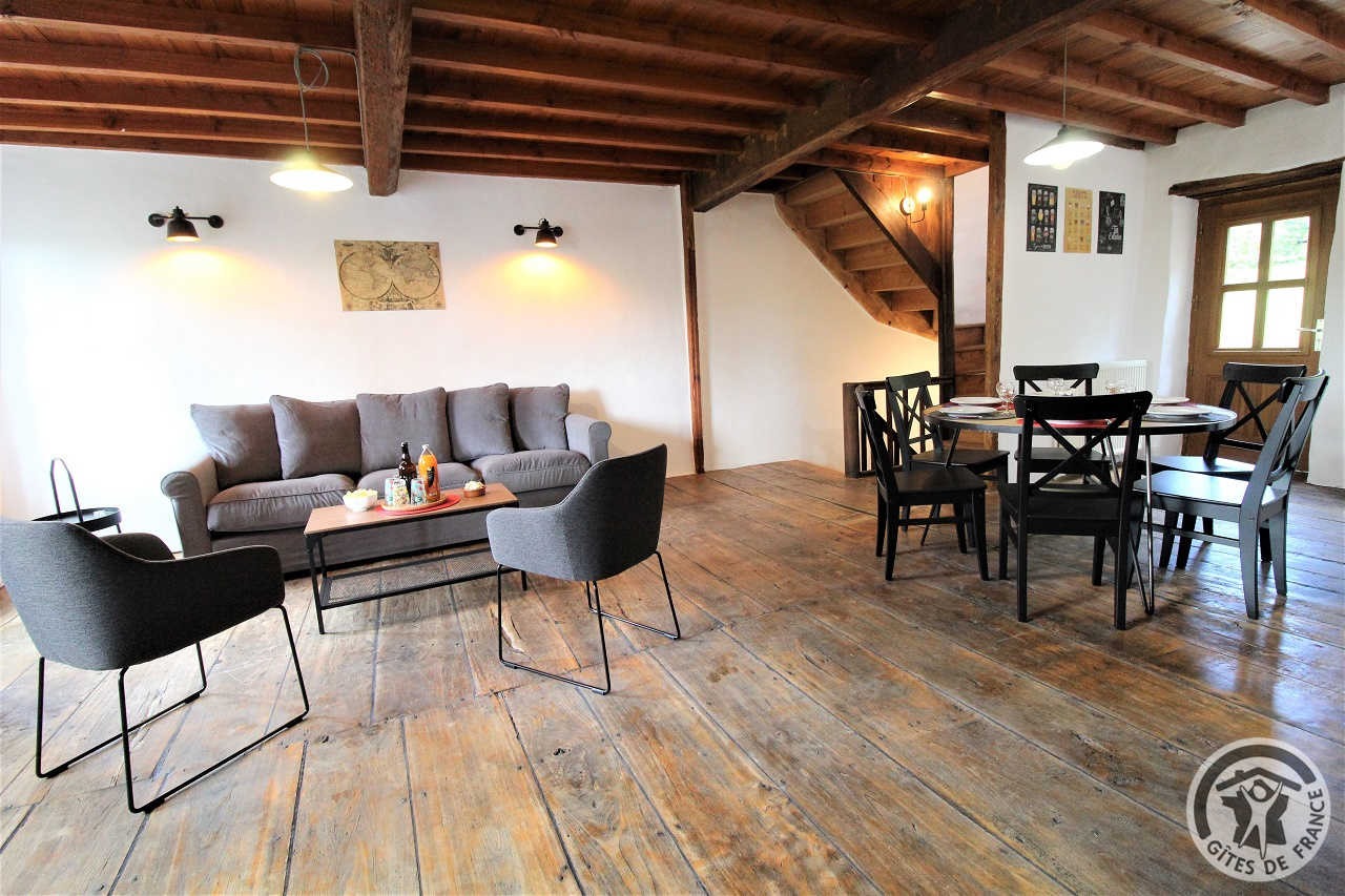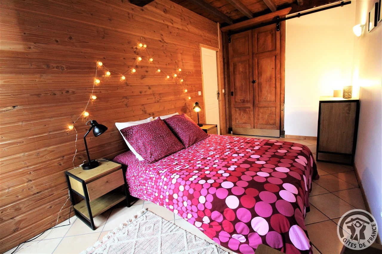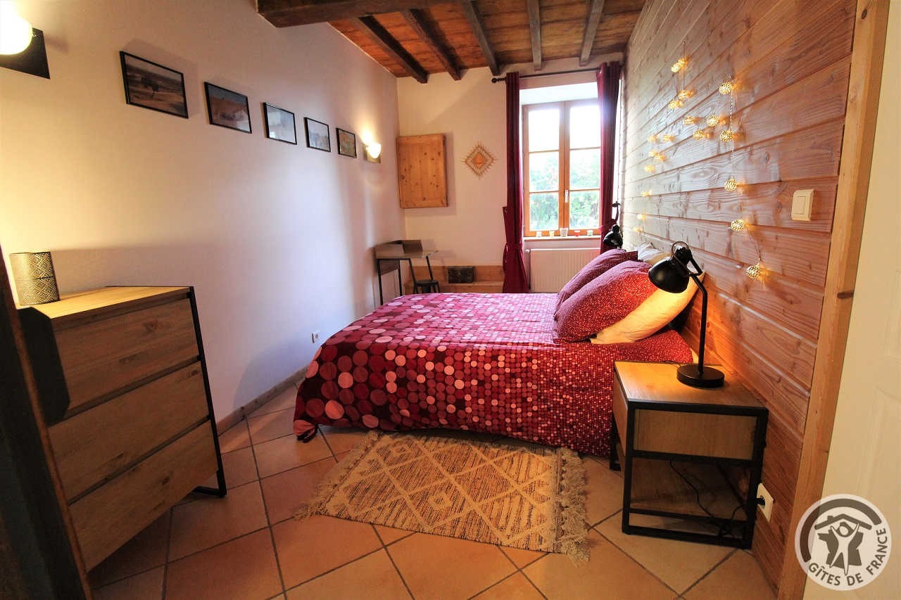 L'accès se fait sur le devant de la maison, de plain-pied (1 marche) puis le gîte donne au 1er étage sur une terrasse et un vaste jardin arboré, clos et privatif sans vis à vis. Au rez-de-chaussée : hall d'entrée (lave-linge et sèche linge, placard mural). 1 chambre (1 lit 2 personnes) avec sa salle de bains et wc privatifs. Au 1er étage ayant un accès direct de plain pied sur les extérieurs : vaste pièce de jour (espace cuisine, espace repas et espace salon avec TV et cheminée). Au 2ème étage : espace détente (TV), 2 chambres (1 chambre 1 lit 2 personnes, 1 chambre 1 lit superposé), salle d'eau incluant Wc. Équipement bébé sur demande (lit, chaise haute, baignoire, matelas à langer). Tout le caractère de l'ancien a été conservé (parquet d'époque, poutres apparentes), jolie décoration. À l'extérieur : terrasse en bois avec spa (pour 2 personnes), salon de jardin, banc, chaises longues, barbecue. Jeux d'enfants (portique, balançoire à bascule). A proximité immédiate, la propriétaire propose un autre gîte de 4 personnes dans une maison en bois complètement indépendante (possibilité de louer les 2 hébergements pour un total de 10 personnes). Dans le village, plusieurs petits commerces (boulangerie, boucherie, épicerie).
