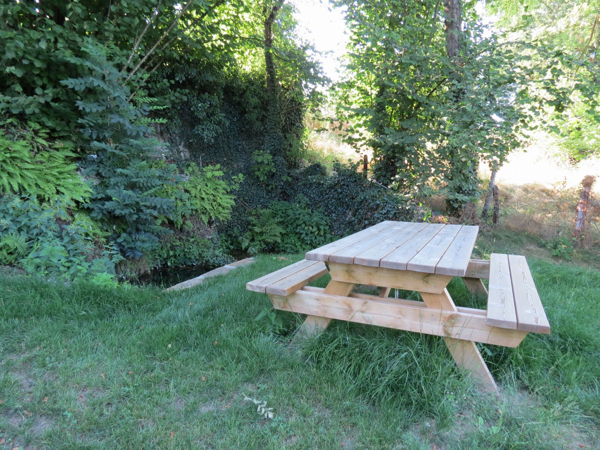 Aire de pique nique aménagée. Une table de pique nique. Petit bassin d'eau.