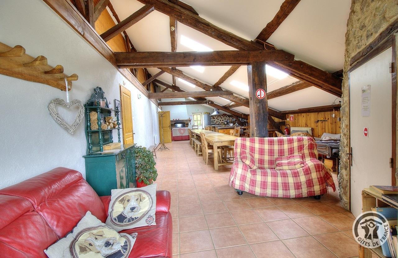 Sur place, l'auberge est à votre service (menus à base de produits locaux). Des poneys peuvent accompagner vos randonnées pour promener les plus petits. Ambiance sympathique, dans un cadre exceptionnel en pleine nature. Au dessus d'un cuvage, possibilité de location en supplément pour vos soirées, accès indépendant : 2 dortoirs (5 lits 1 pers.), 2 dortoirs (1 lit 2 pers. et 3 lits 1 pers.). Sanitaires privés ds chacun. Grande pièce à vivre (100 m²) donnant sur une terrasse privée, coin-cuisine, coin-repas, coin détente (cheminée) Possibilité de couchages supplémentaire dans une partie annexe pour 12 personnes avec sanitaires + 5 dans une petite maison sur le même site. Salle de réception (30 pers.) dans un ancien cuvage.
