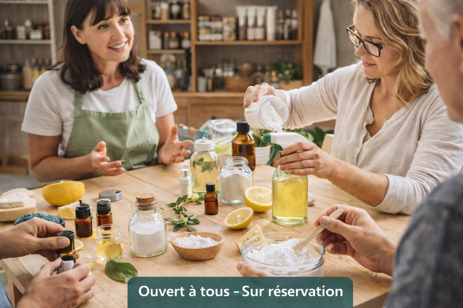 Dans une ambiance chaleureuse et conviviale, cet atelier te permet de découvrir des recettes simples et rapides pour fabriquer tes propres produits ménagers naturels.