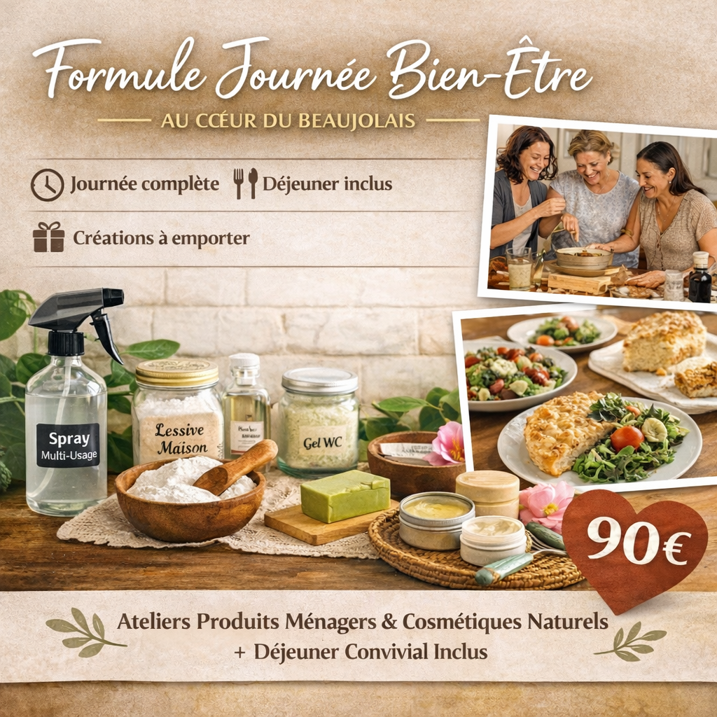 Profitez d’une journée bien-être et créative au cœur du Beaujolais : ateliers de produits naturels (ménagers et cosmétiques) et déjeuner maison inclus.