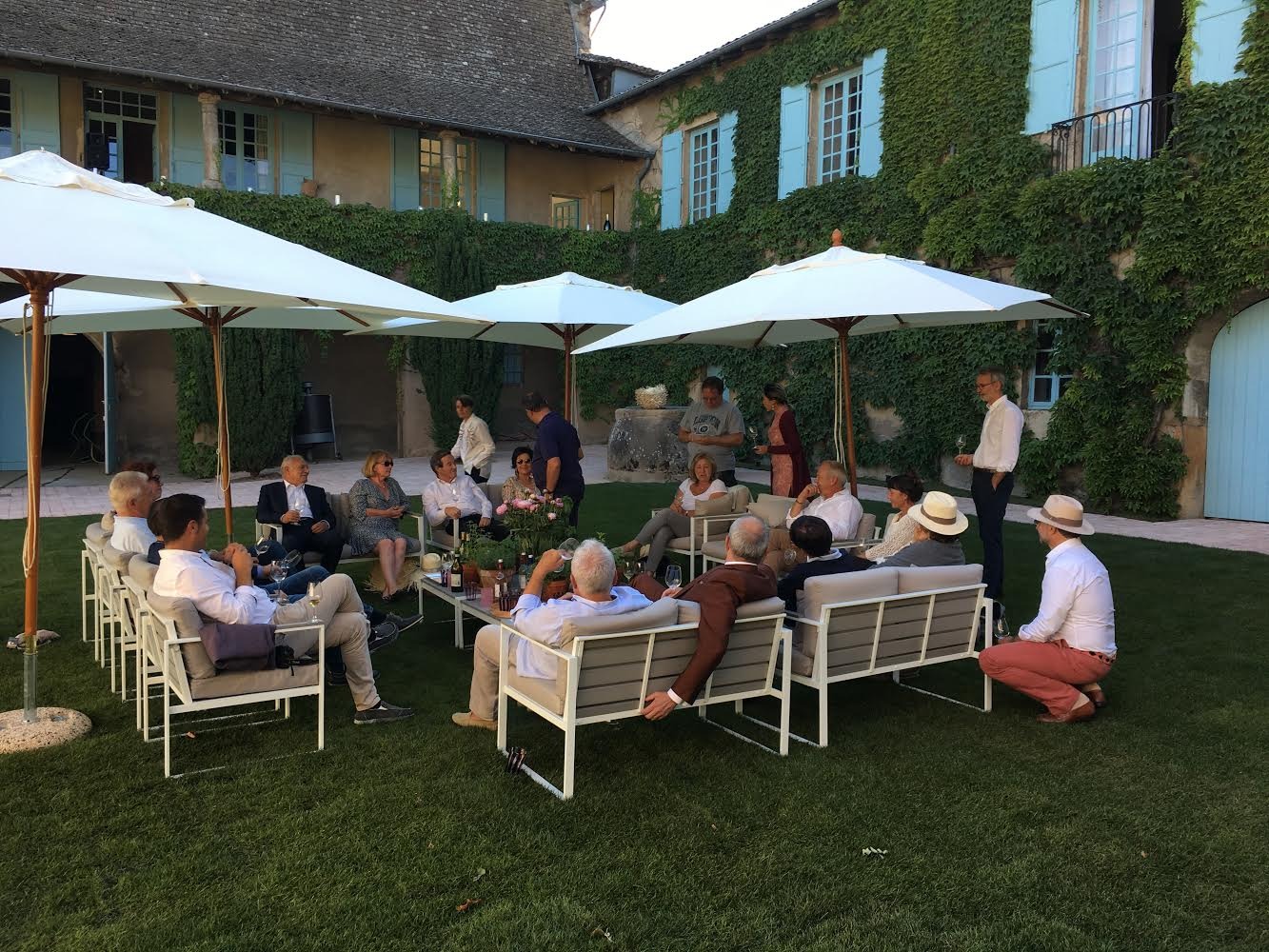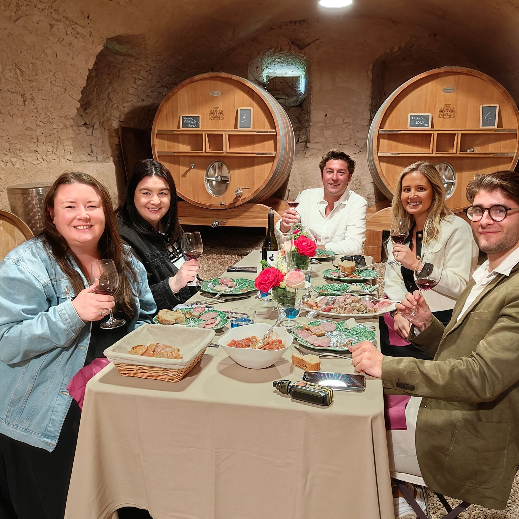 Selon la période de l’année, le repas est servi dans notre clos avec vue sur les vignes, dans le chai d’élevage ou dans le salon du château. Chaque table est dressée avec soin, incluant pain, eau, café et une bouteille de vin du domaine pour quatre convives.