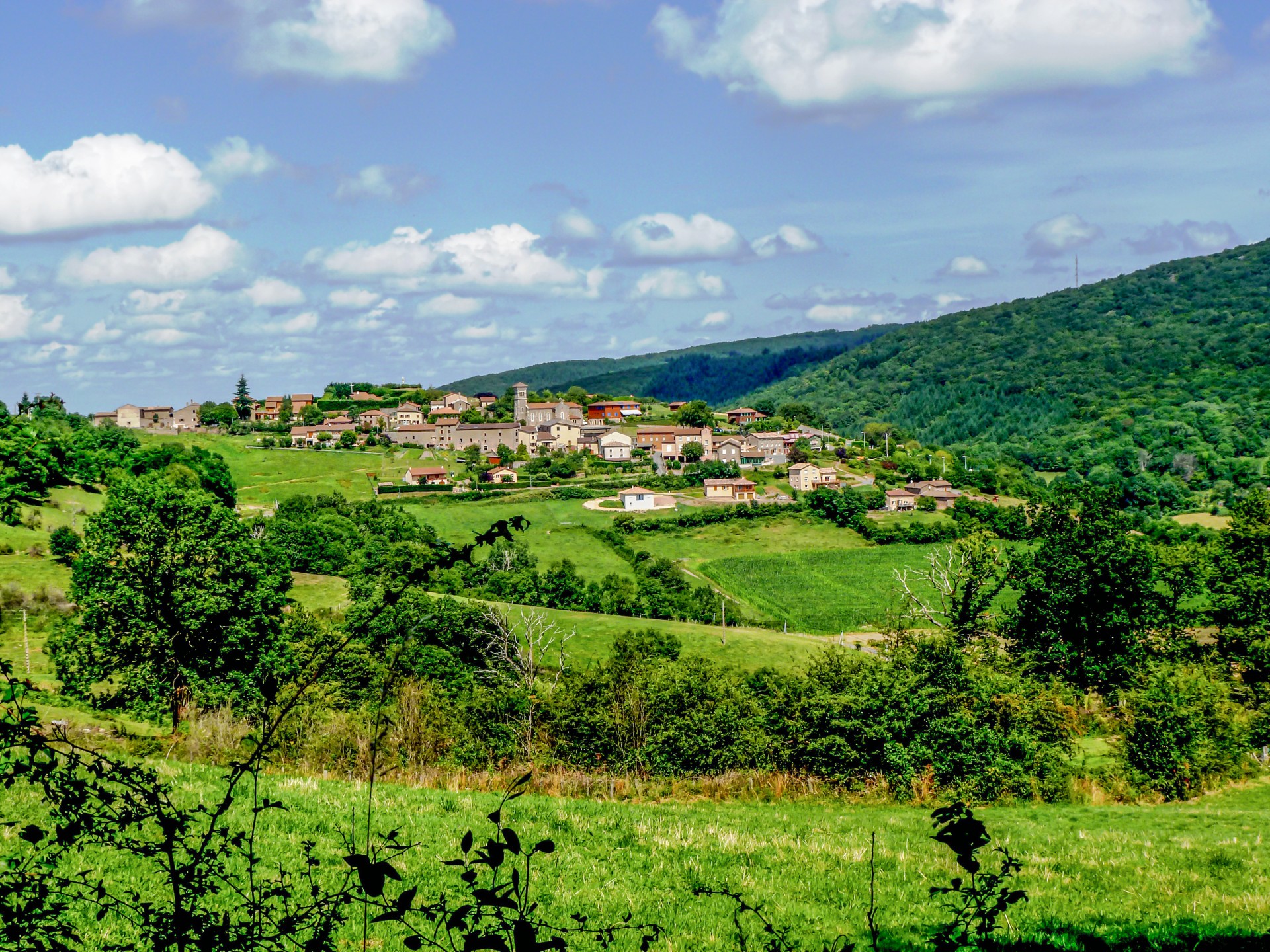 Le chemin conduit ensuite vers Saint-Jacques-des-Arrêts, un village singulier qui abrite une église remarquable présentant une exposition permanente des œuvres du peintre lyonnais Jean Fusaro, figure importante de la peinture figurative. L’itinéraire se poursuit jusqu’au village d’Ouroux, niché dans la vallée de la Grosne orientale. Les marcheurs peuvent y découvrir une église au clocher original décoré d’une étoile de David.