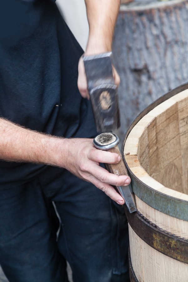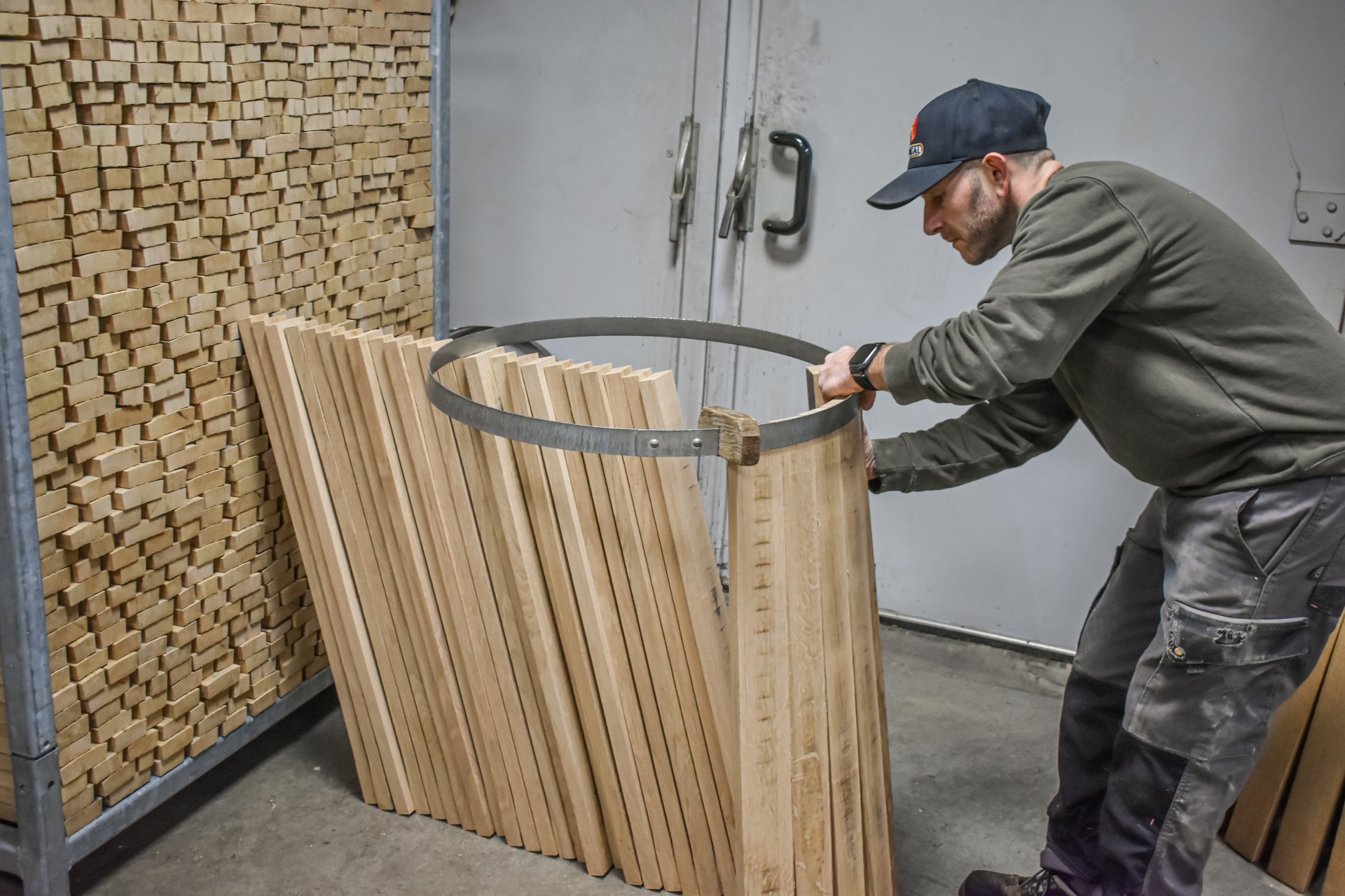 Malgré la rudesse du métier, il œuvre « à l’ancienne », fidèle aux traditions. 5000 coups de marteau accompagnent le montage des cinq fûts qu’il monte quotidiennement. L’installation d’une presse destinée à la finition du cerclage vient tout même soulager l’effort.