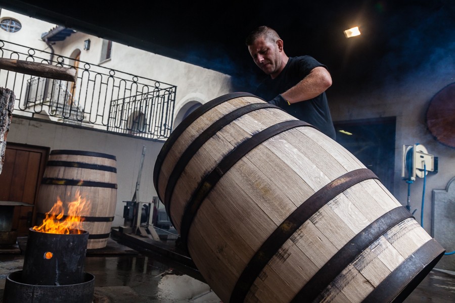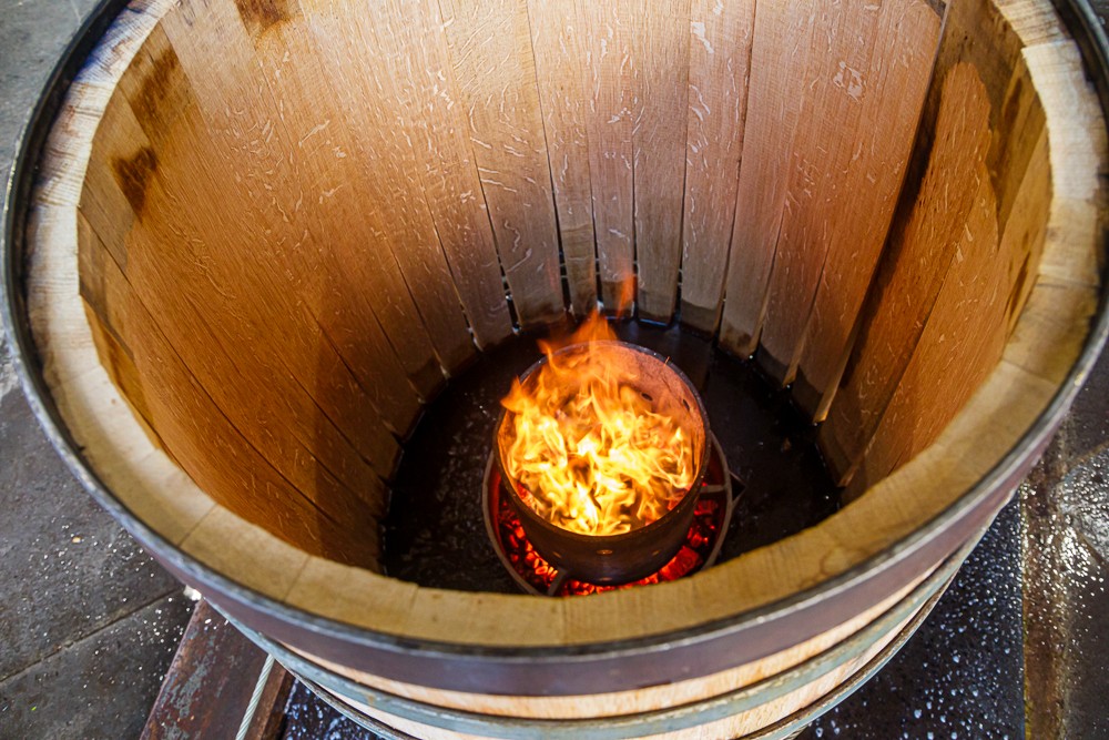 Cette dernière étape primordiale se fait au flair et à l’œil. La technique consiste à toaster à la flamme l’intérieur des barriques pour révéler les arômes du bois. Elle emplit l’atmosphère de parfums gourmands, mélange de vanilline, de noisettes et amandes grillées.