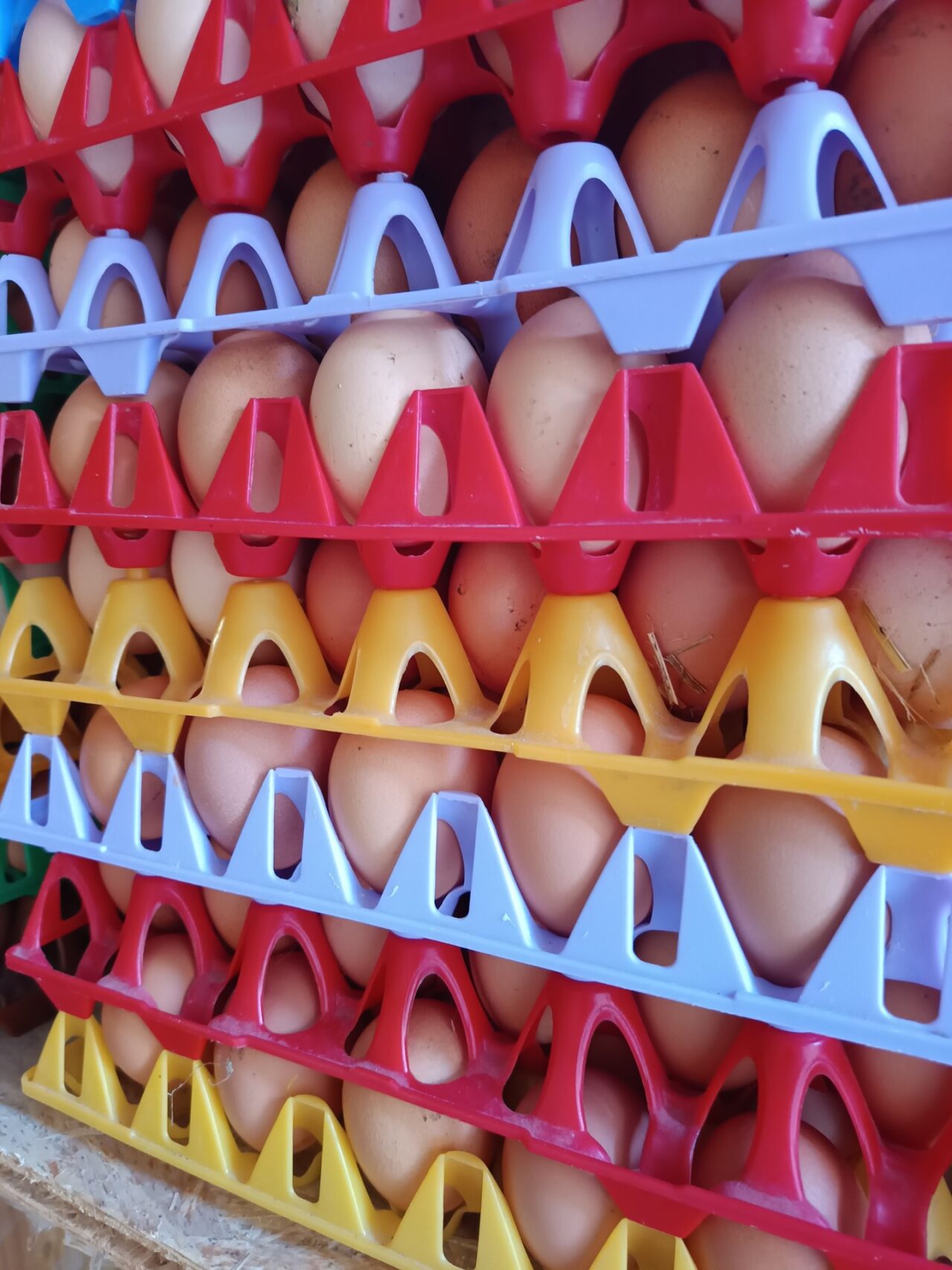 À la Ferme de la Fouillouse, environ 5 000 œufs sont récoltés chaque semaine. Il faut savoir que la lumière et l’alimentation, notamment, stimulent la ponte. Si dans une basse-cour domestique, les poules se couchent avec le soleil, l’utilisation d’éclairage artificiel des élevages avicoles allongent leurs journées, augmentant ainsi la production.