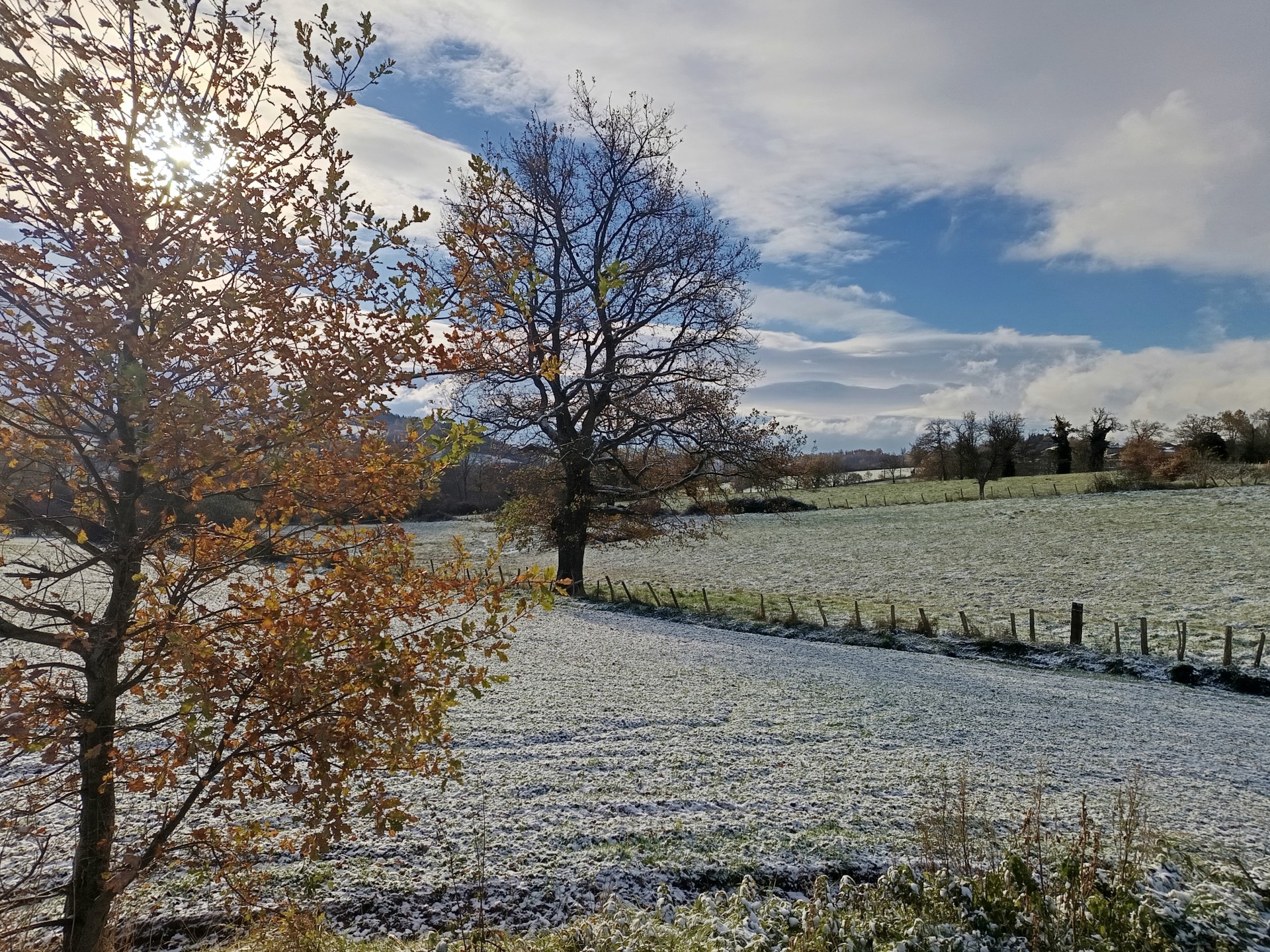 Ce matin l’air sent bon la neige, les premiers flocons sont tombés pendant la nuit. Entre les brumes légères et la teinte rosée du ciel matinal, la campagne revêt l’allure d’un tableau impressionniste.